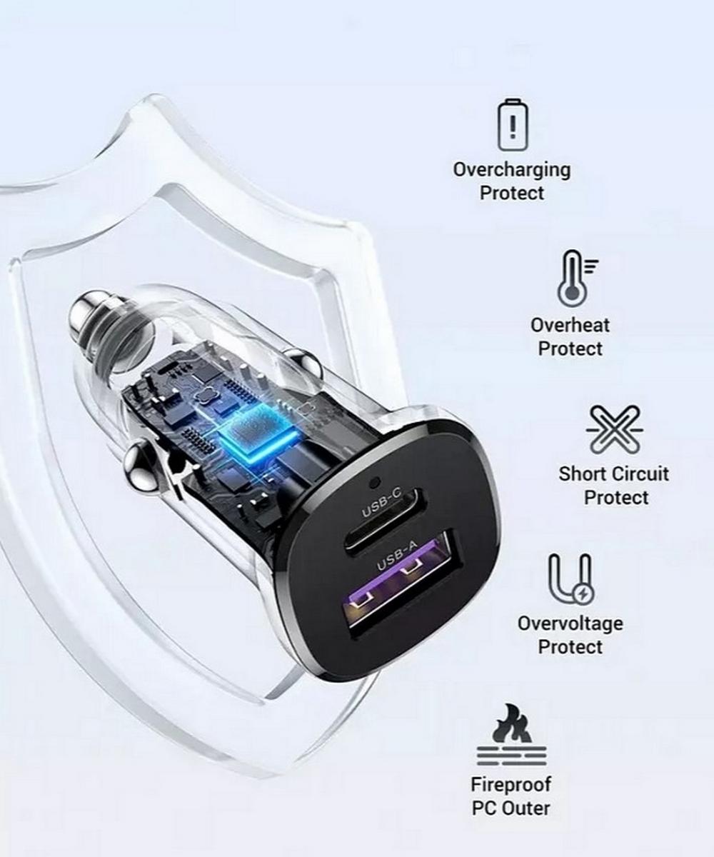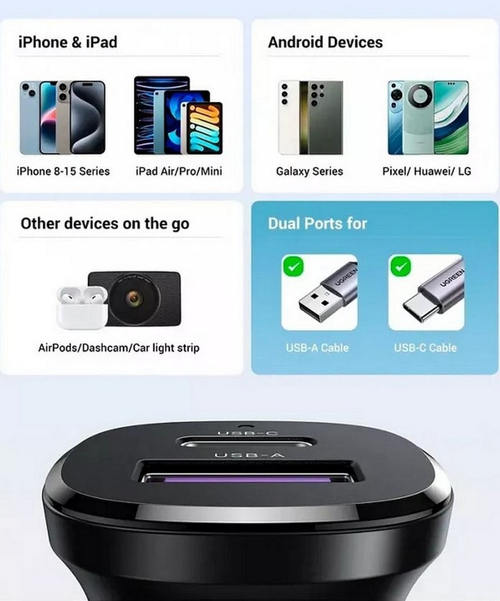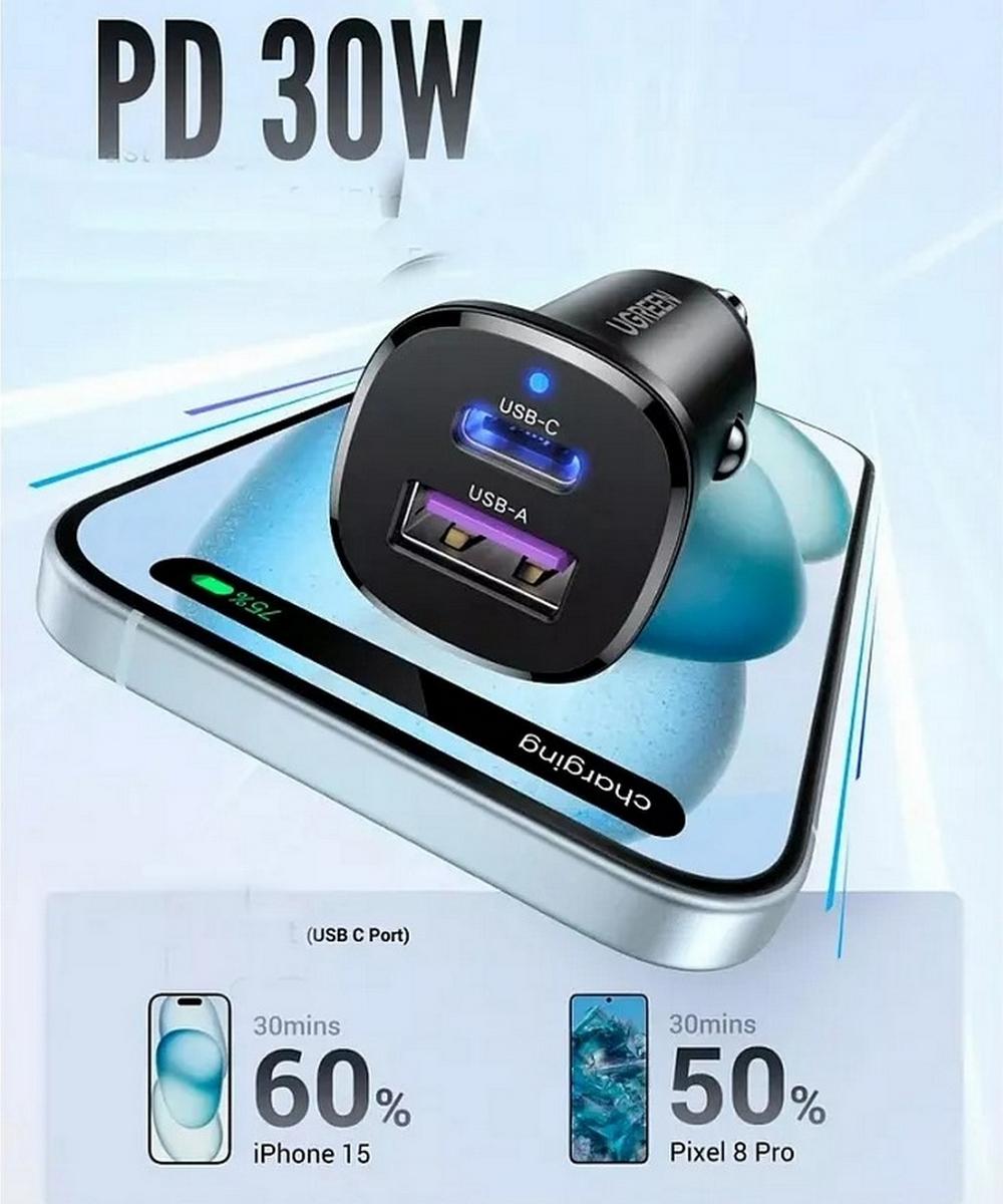 Автомобильное зарядное устройство UGREEN EC305 (25845) обеспечивает быструю и безопасную зарядку для различных устройств, включая смартфоны, планшеты и наушники. Устройство имеет два выхода: USB-C с максимальной мощностью 30 Вт и USB-A с мощностью до 22,5 Вт, поддерживая стандарты быстрой зарядки, такие как QC3.0, PD3.0, PPS, FCP, AFC и другие.