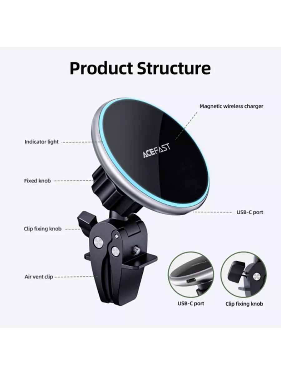 Компактная конструкция автомобильного держателя Acefast D3 Magnetic Wireless Charging Car Holder Silver не закрывает обзор, что делает эксплуатацию безопасной. Габариты равны 65х15 мм. Корпус изготовлен из качественных материалов высокой прочности - пластика и металла. Они не подвержены износу и механическим повреждениям.