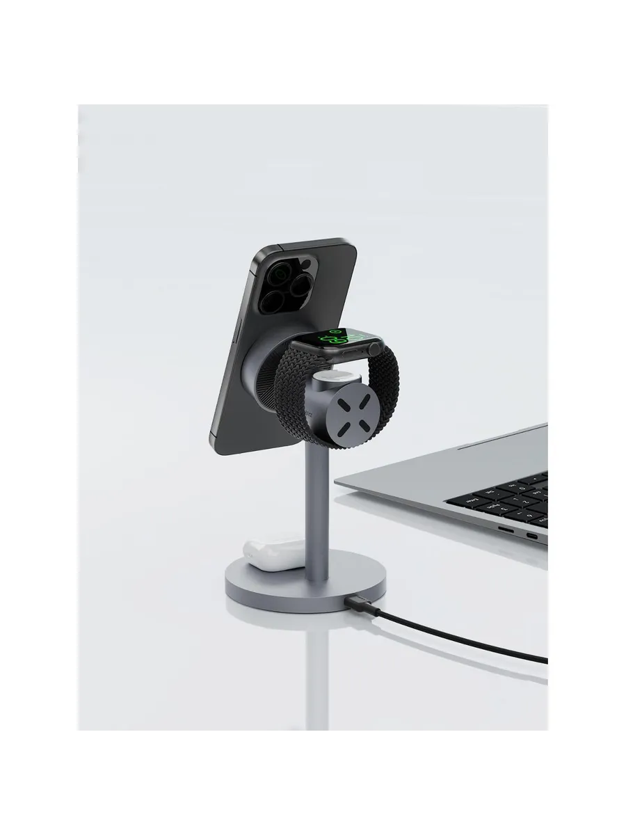 Универсальный дизайн «3 в 1» заряжает iPhone, Apple Watch и Airpods одновременно.