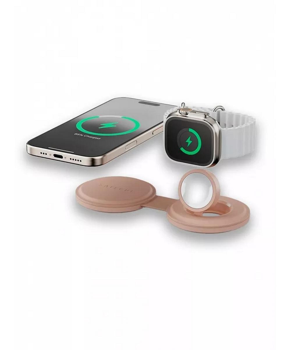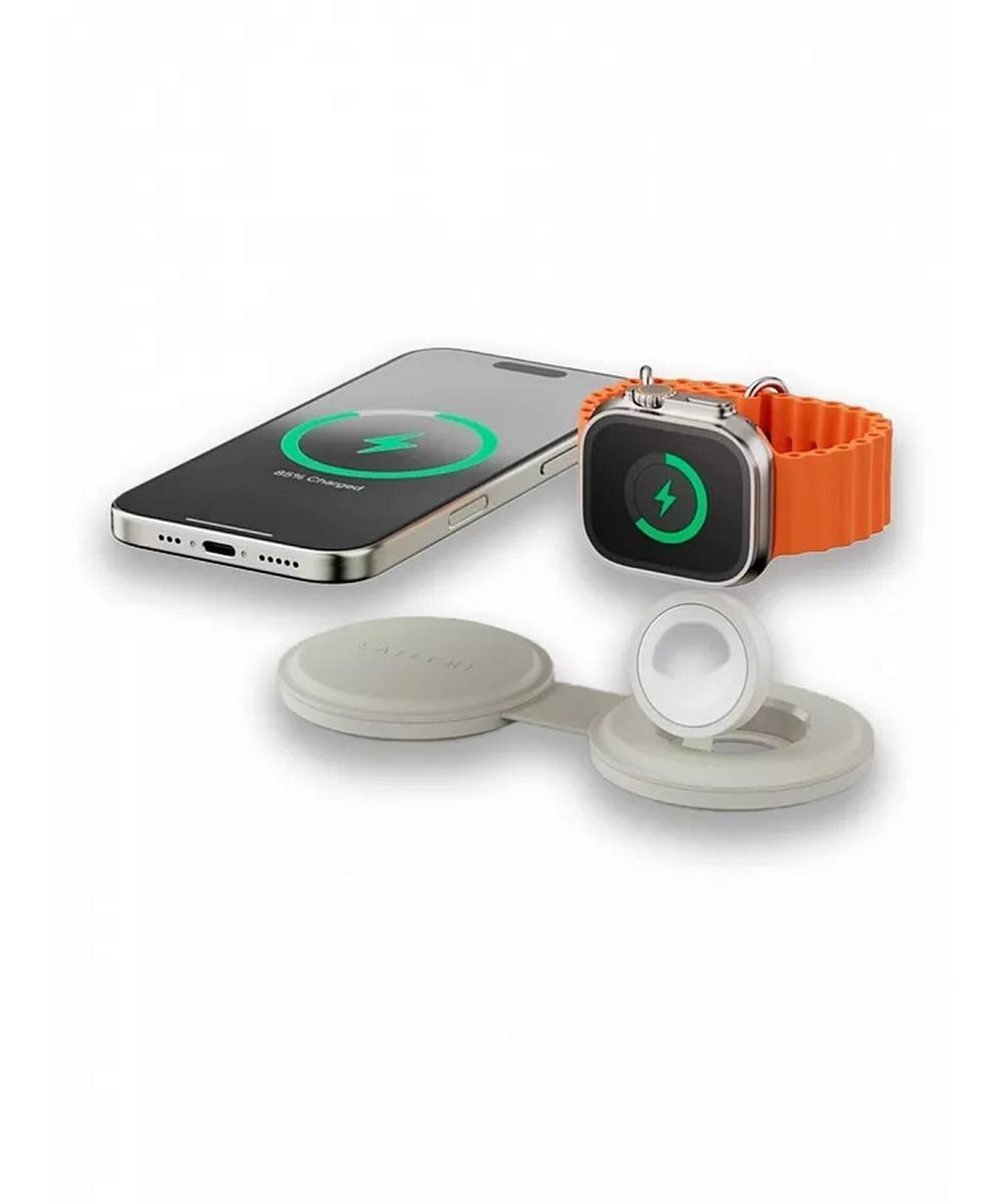 Satechi OntheGo 2-in-1 — это универсальное беспроводное зарядное устройство, позволяющее одновременно заряжать iPhone, Apple Watch и даже AirPods. Оно поддерживает современные стандарты Qi и Qi2, а также совместимо с MagSafe, обеспечивая быструю и стабильную зарядку. Для iPhone предусмотрена мощность до 15 Вт, для Apple Watch — до 5 Вт с поддержкой ускоренной зарядки на моделях Series 7–10 и Ultra/Ultra 2, а для AirPods — до 5 Вт. Встроенные магниты обеспечивают точное позиционирование устройства и максимальную эффективность передачи энергии.