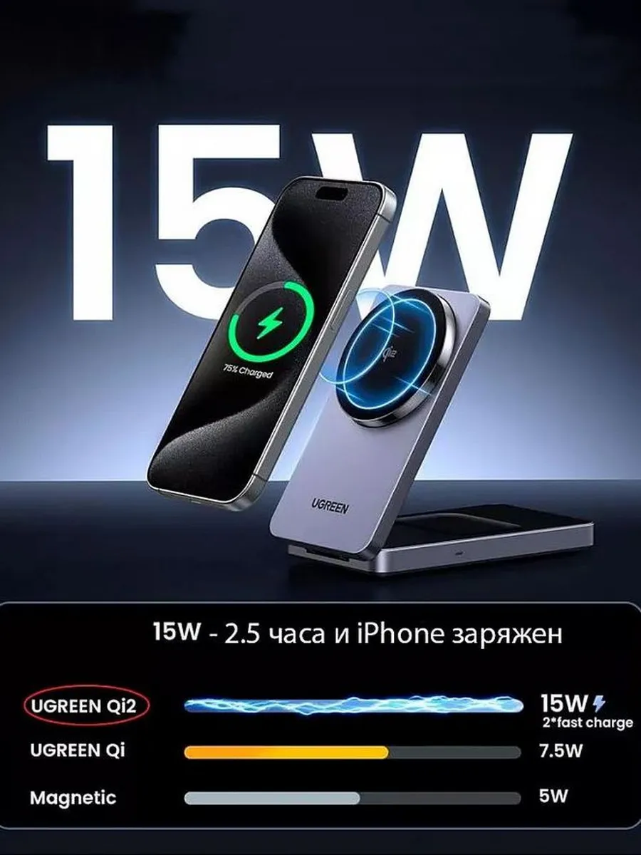 Беспроводное зарядное устройство с технологией Qi2 обеспечивает мощность до 15 Вт, позволяя быстро и эффективно заряжать совместимые устройства. Например, оно может зарядить iPhone 16 с 0% до 37% всего за 30 минут. Устройство поддерживает модели iPhone 16, 15, 14, 13 и 12, а также наушники AirPods 2, AirPods 3 и AirPods Pro (кроме моделей A1602 и A2897).