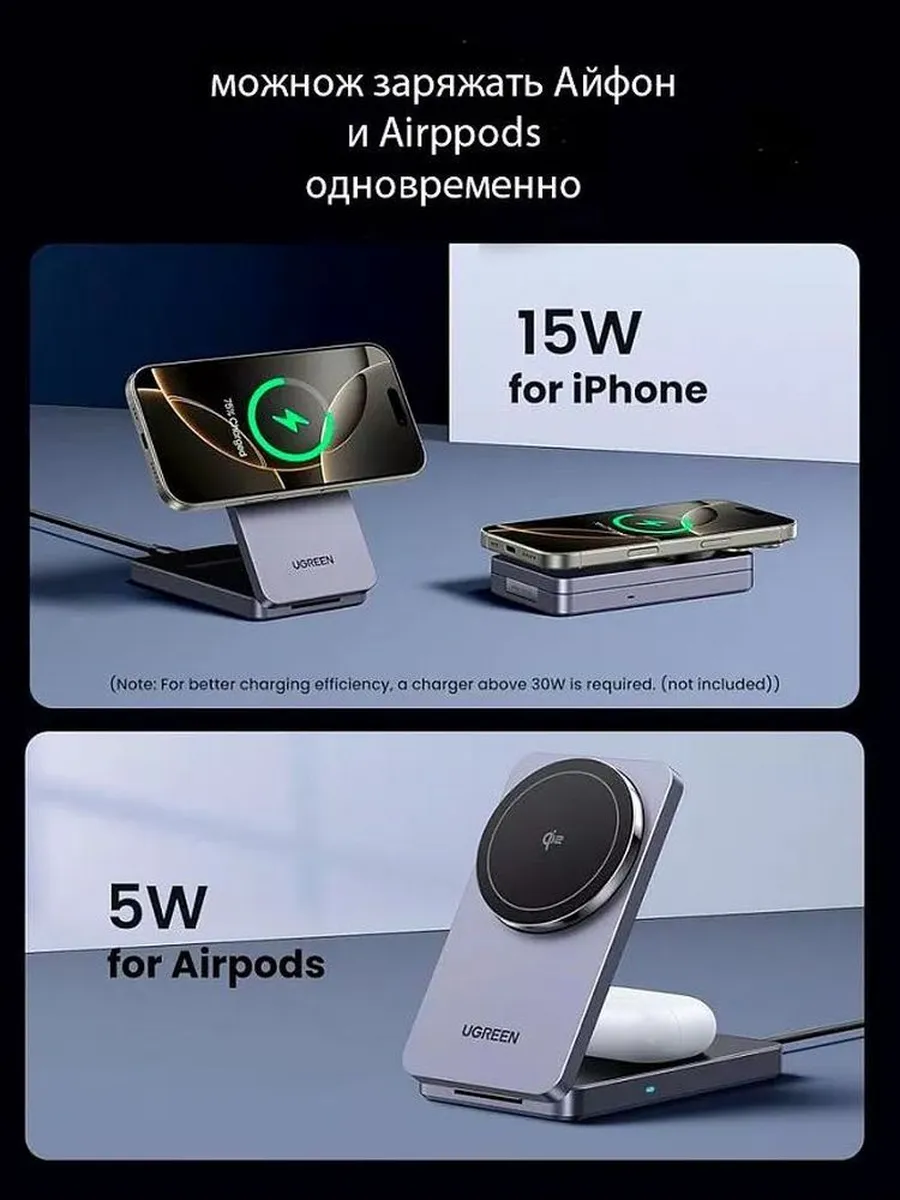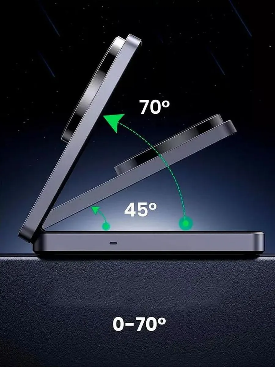 Особенности: Компактный складной дизайн, регулируемый угол наклона (до 70°), возможность одновременной зарядки двух устройств;