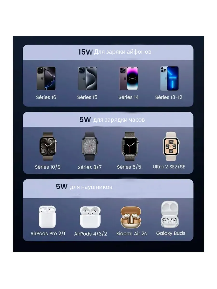 Оно способно зарядить iPhone 16 Pro от 0 до 40% примерно за 30 минут, а iWatch SE от 0 до 47% за 60 минут. Однако время зарядки может варьироваться в зависимости от температуры окружающей среды, использования устройства и характеристик кабеля. Для iPhone серий 13–16 требуется iOS версии не ниже 17.2 для поддержки быстрой зарядки 15 Вт, при этом на экране появляется анимация зарядки, а для iPhone 12 необходима iOS 17.4 или выше.