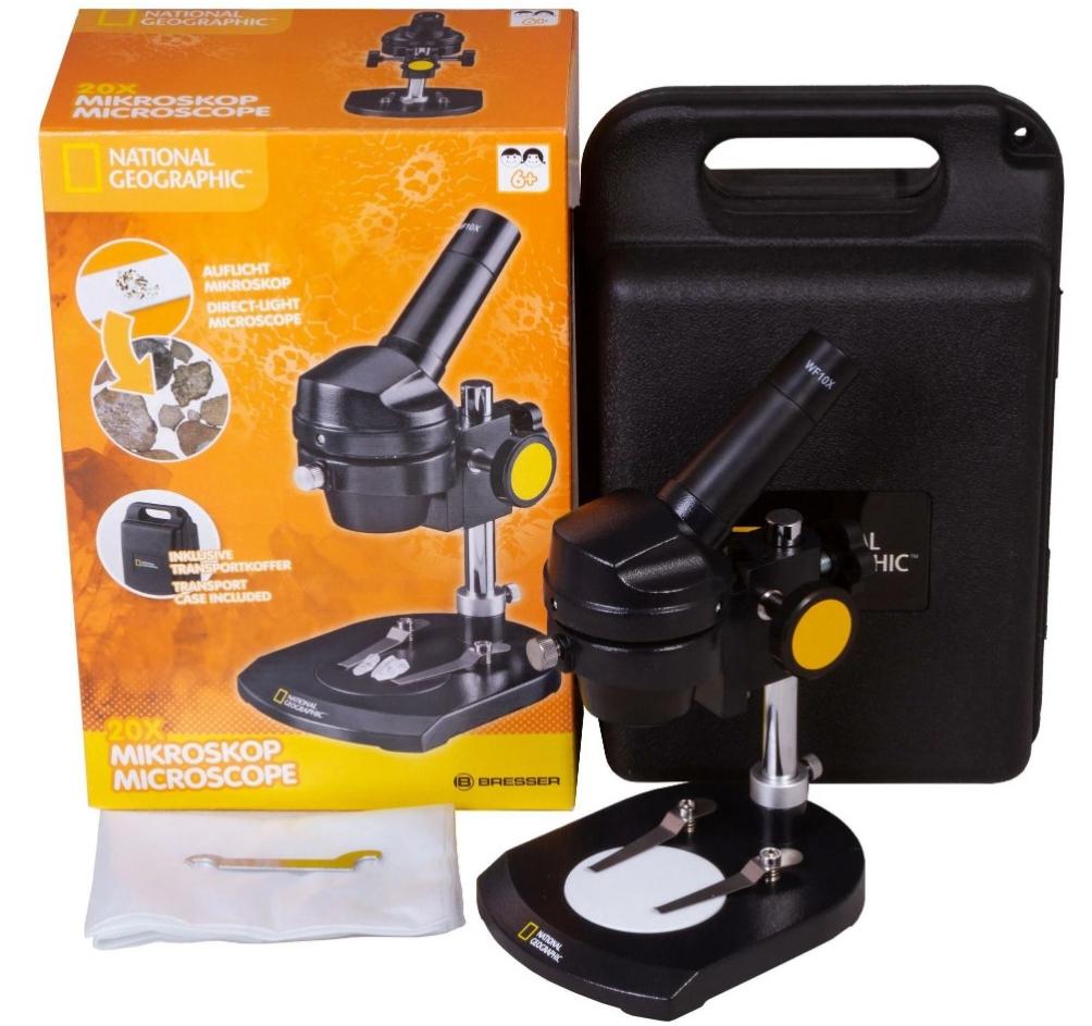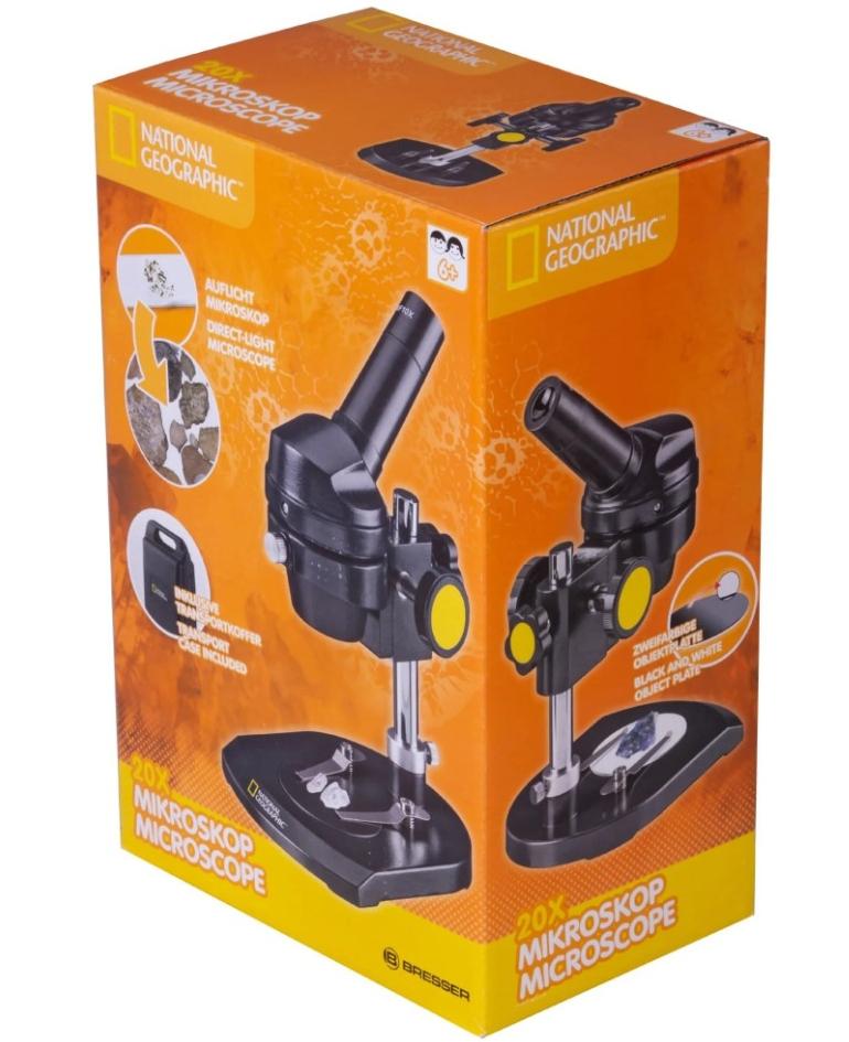 Микроскоп Bresser National Geographic 20x предназначен для изучения листьев, монет, минералов и других объектов окружающего мира высотой до 80 мм. Он отлично подойдет для научного хобби и знакомства с основами биологии. Микроскоп станет прекрасным подарком ребенку, которого интересует, как устроен окружающий мир. В микроскопе используется монокулярная насадка, которую можно поворачивать на 360°. Окулярная трубка наклонена под углом в 45°. Микроскоп дает одно увеличение в 20 крат, а наблюдения ведутся в естественном освещении. Оптический прибор можно ставить вблизи окна или использовать на улице – так образцы будут освещены наиболее равномерно и ярко. Предметный столик – это двусторонняя черно-белая пластина. Благодаря этому рассматривать через микроскоп можно как светлые или белые, так и очень темные объекты. Передаваемое изображение получается четким и контрастным. Микроскоп Bresser National Geographic 20x устойчив, надежен и прост в использовании. Отличный выбор для начинающего исследователя или ребенка. Особенности: Монокулярная поворотная на 360° насадка Широкий угол обзора, 20-кратное увеличение Наблюдения в естественном освещении Рабочее расстояние – от 35 до 80 мм Металлический корпус, устойчивое основание Комплект поставки: Микроскоп Широкопольный окуляр WF10x Черно-белая пластина Пылезащитный чехол Жесткий кейс с ручкой Инструкция по эксплуатации и гарантийный талон