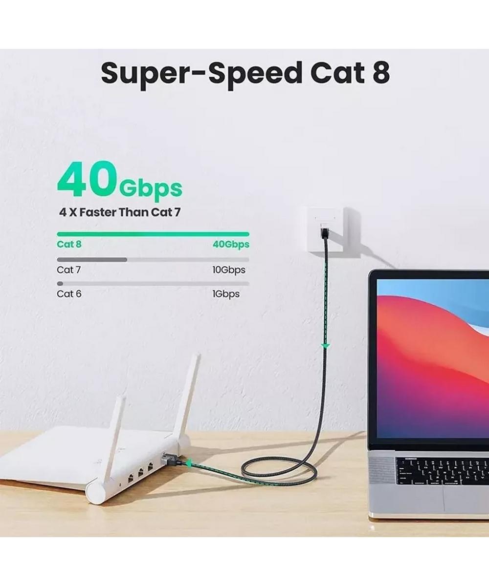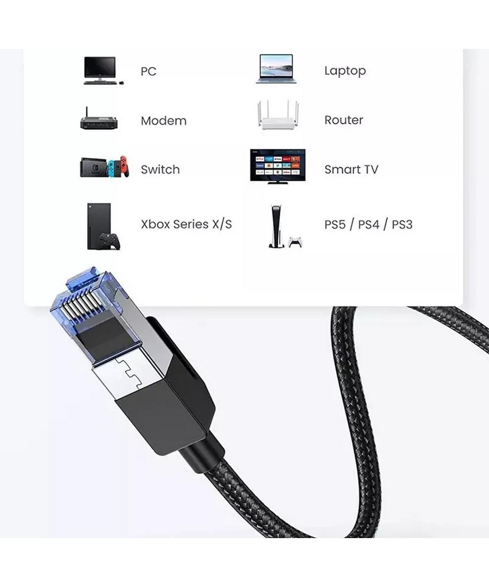 Кабель Ugreen NW153 Cat8 оснащен двумя коннекторами RJ45. Он способен передавать данные со скоростью до 40 Гбит/с. Он совместим с компьютерами, ноутбуками, модемами, маршрутизаторами, PS5, PS4, PS3, X-Box 360, X-Box One, коммутаторами, сетевыми коммутаторами, ADSL, сетевыми адаптерами, концентраторами и другим сетевым оборудованием. Обратно совместим с Cat7, Cat6e, Cat6, Cat5e, Cat5. Специальная конструкция разъемов кабеля защищает их от повреждений при многократном использовании.