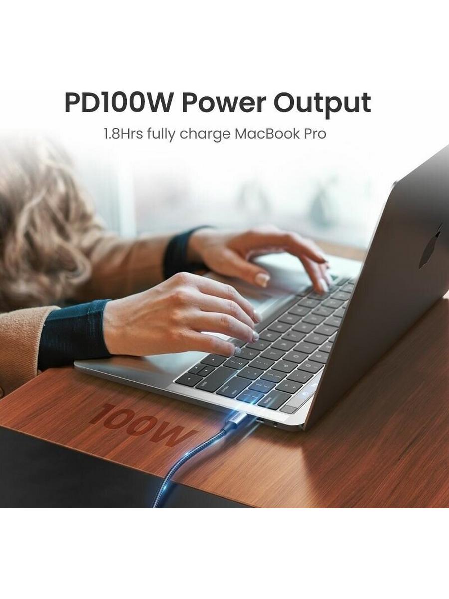Кабель UGREEN USB C-USB C поддерживает быструю зарядку PD до 100 Вт 20 В/5 А, 15 В/3 А, 12 В/3 А, 9 В/3 А, 5 В/3 А с адаптерами питания USB-C, такими как PD 18 Вт / 30 Вт / 45 Вт / 60 Вт / 61 Вт / 87 Вт / 96 Вт. Он также поддерживает протокол Huawei FCP, Qualcomm QC 3.0 и Xiaomi Fast Charge. Полная зарядка MacBook Pro 15 дюймов занимает всего 112 минут — так же быстро, как и при использовании оригинального зарядного кабеля. Данный кабель UGREEN c обеспечивает скорость передачи до 480 Мбит/с (USB 2.0), чтобы вы могли перемещать 1 ГБ фильмов, музыки, документов или всей библиотеки фотографий за 30 секунд.