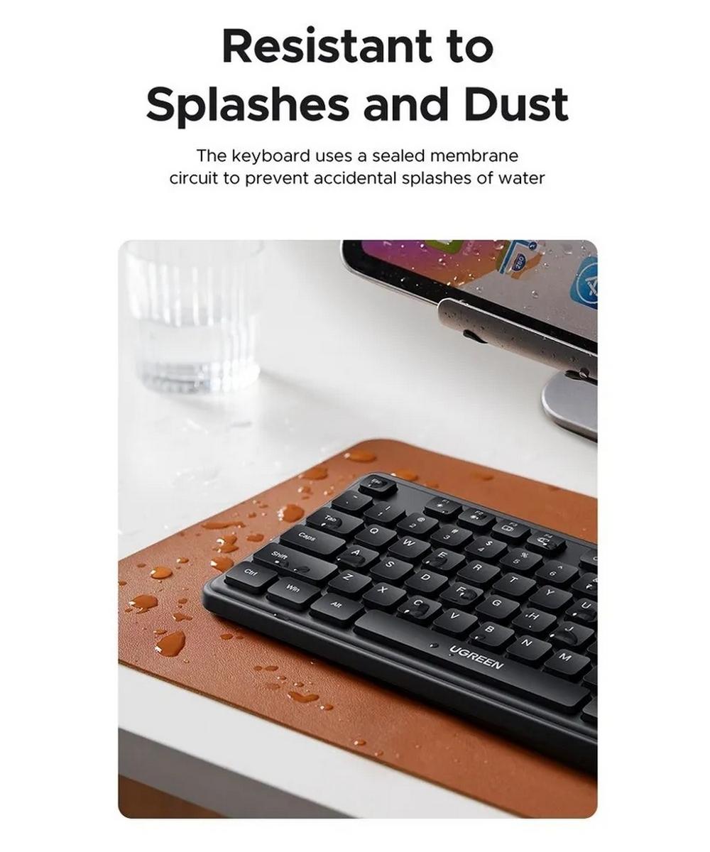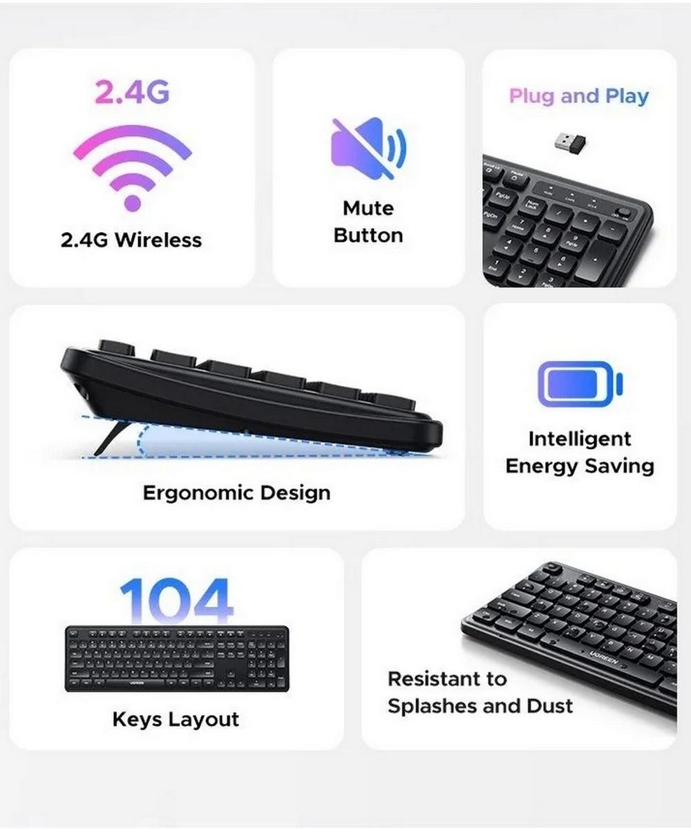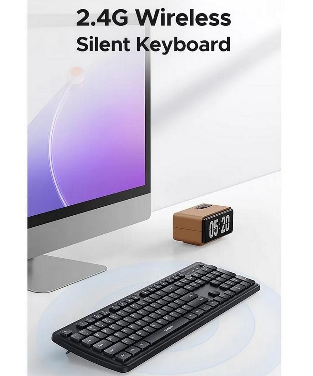 Беспроводная клавиатура UGREEN K331 (артикул 55654) в чёрном цвете — практичное и эргономичное решение для работы и развлечений. Устройство использует беспроводное подключение по радиоканалу 2.4 GHz: достаточно вставить компактный USB‑ресивер в свободный порт компьютера, и соединение установится автоматически на расстоянии до 10 метров. Клавиатура выполнена в полноразмерном формате ANSI с 104 клавишами, включая цифровой блок, и поддерживает русскую и английскую раскладки.