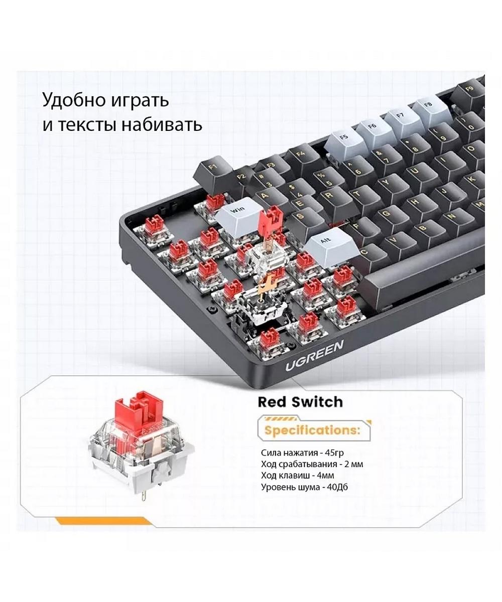 Одной из ключевых особенностей UGREEN KU103 является светодиодная подсветка, которая не только придает устройству стильный внешний вид, но и облегчает работу в условиях низкой освещенности. Функция защиты от фантомных нажатий (анти-гостинг) обеспечивает точное и одновременное срабатывание нескольких клавиш, что особенно важно для геймеров и тех, кто часто набирает большие объемы текста.