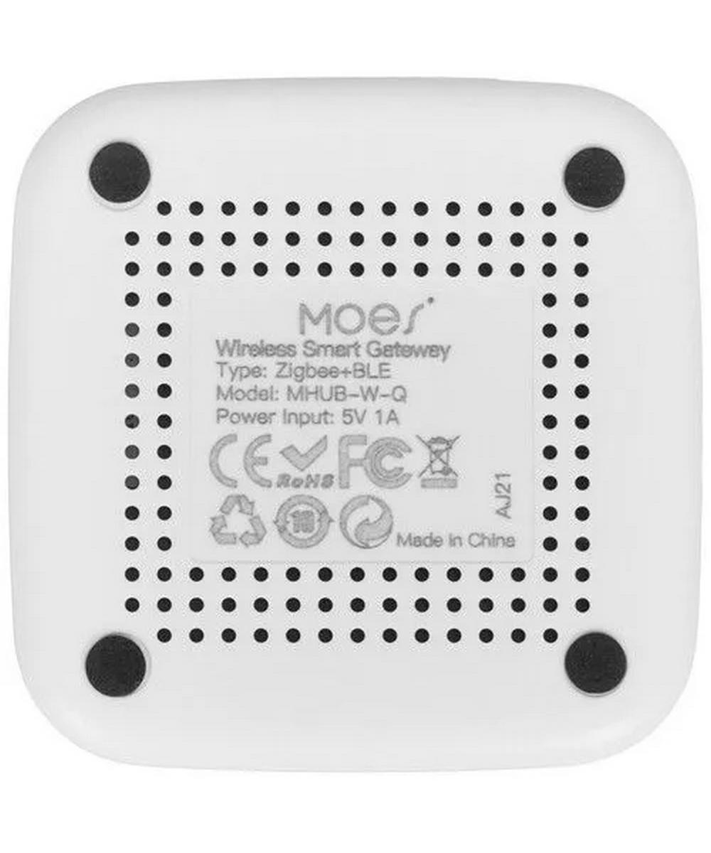 ZigBee‑шлюз Moes ZHUB‑W‑MS — многофункциональный хаб для системы умного дома, объединяющий Bluetooth‑ и ZigBee‑устройства в единой экосистеме с управлением через мобильное приложение. Устройство выполнено в белом корпусе из PC+ABS, имеет компактные размеры 60 × 60 × 15 мм и весит 84 г в упаковке. Питание осуществляется от источника 5 В с максимальным током 2 А и нагрузкой до 5 Вт. Шлюз работает в сети Wi‑Fi на частоте 2,4 ГГц (стандарт IEEE 802.11 b/g/n) и поддерживает беспроводной протокол ZigBee 3.0. Он совместим с мобильными операционными системами iOS 8.0 и выше, а также Android 4.0 и новее. Рабочие условия предусматривают температурный диапазон от −10 до 55 ℃ и влажность от 10 до 90 % RH (без конденсации), а дальность передачи сигнала составляет 10–30 м.