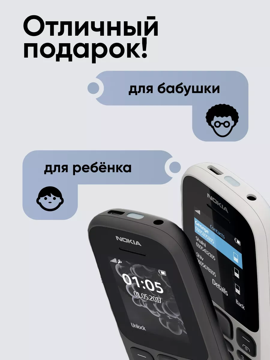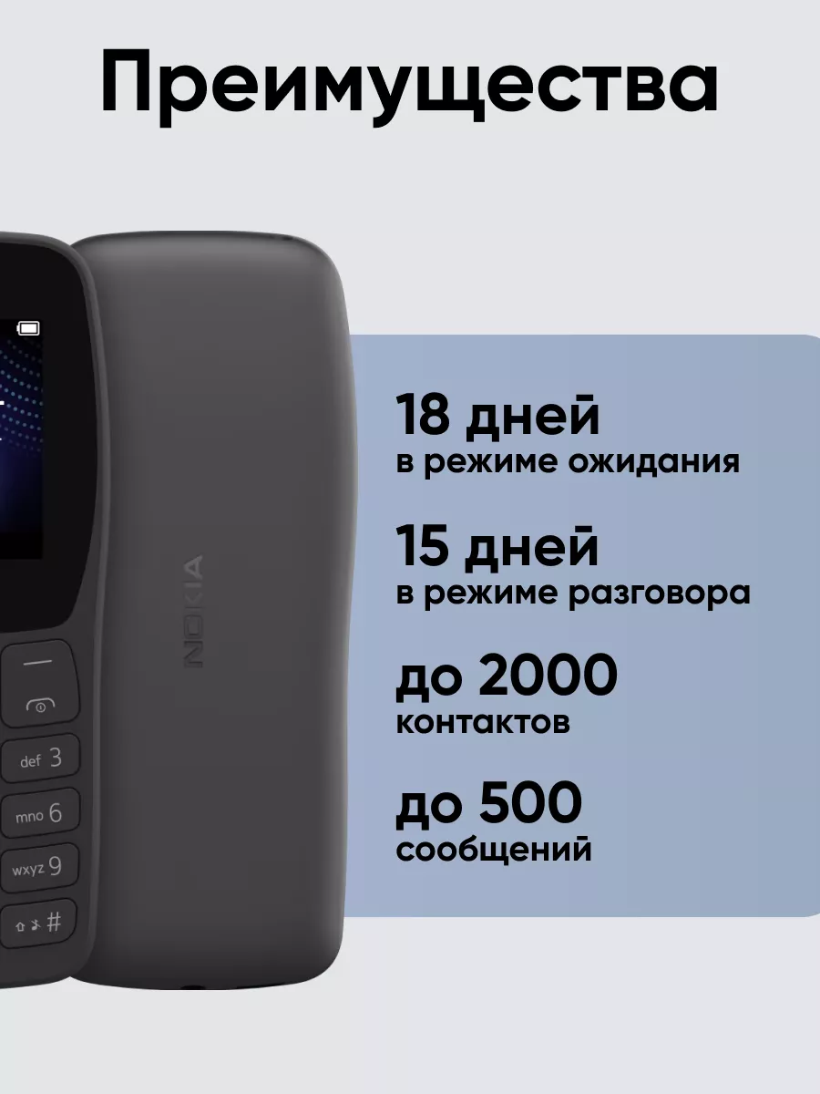 Nokia 105 имеет долговечный корпус из поликарбоната, устойчивого к царапинам. Телефон отлично выглядит не только в момент покупки, но и после длительного использования.