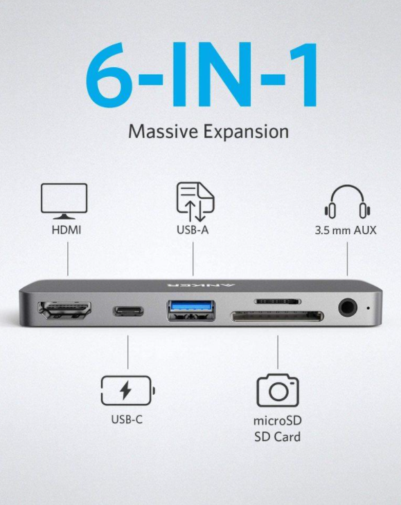 Anker USB-C мульти-переходник для iPad Pro, адаптер PowerExpand Direct 6-в-1 USB-C, с питанием 60 Вт, портом HDMI 4K 60 Гц, разъемом для наушников 3.5 мм, портом USB 3.0, устройством для чтения карт SD и microSD.