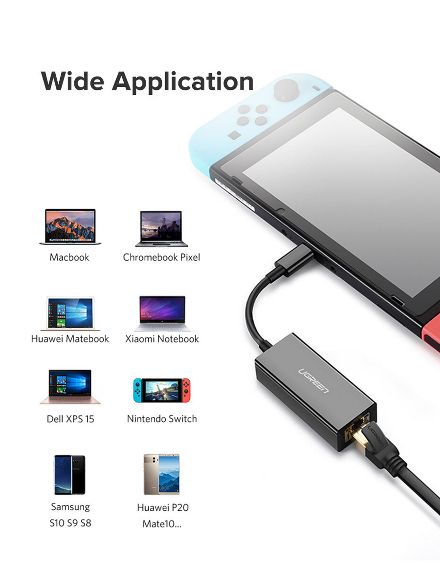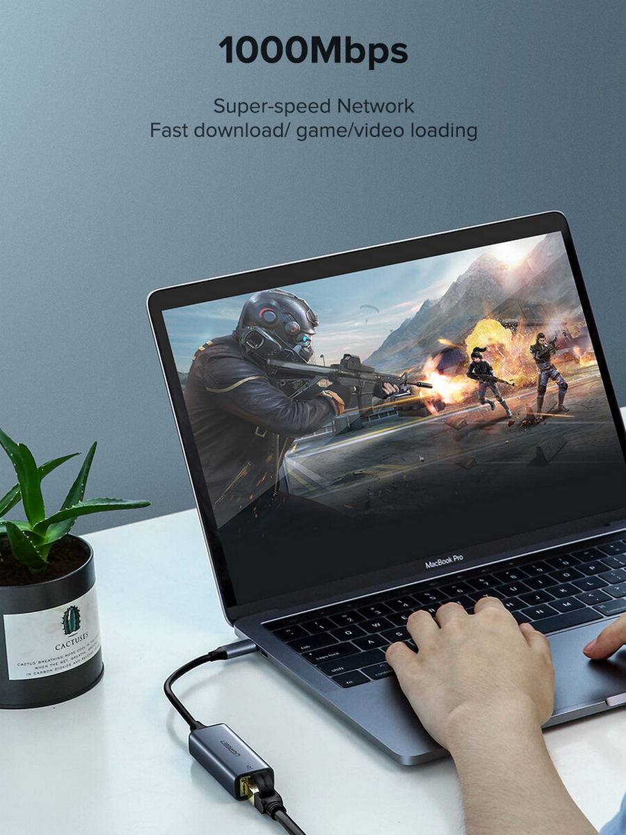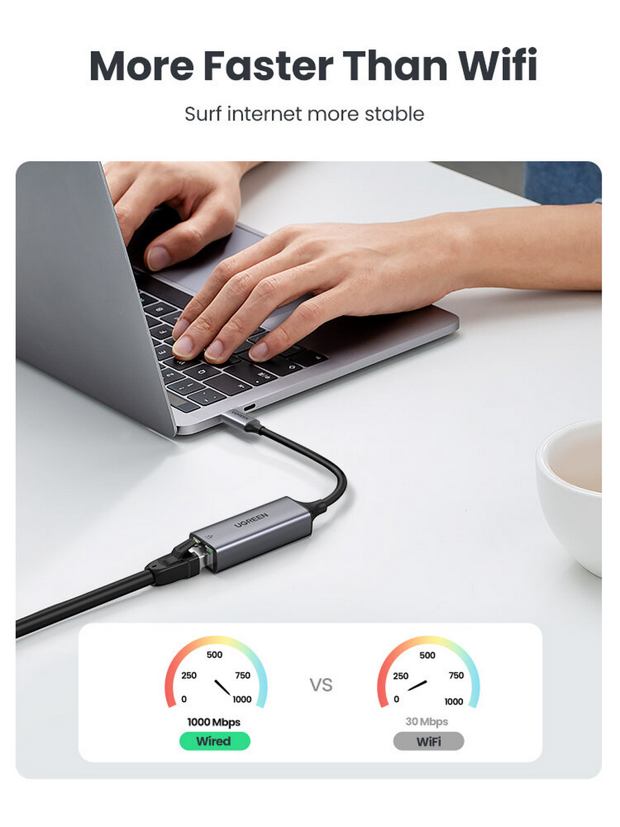 Адаптер UGREEN USB C 3.1 к Gigabit Ethernet преобразует порт USB-C в порт Gigabit Ethernet и обеспечивает более высокую и надежную скорость сети, чем Wi-Fi. Это полезно для предотвращения помех Wi-Fi и проблем с конфиденциальностью.