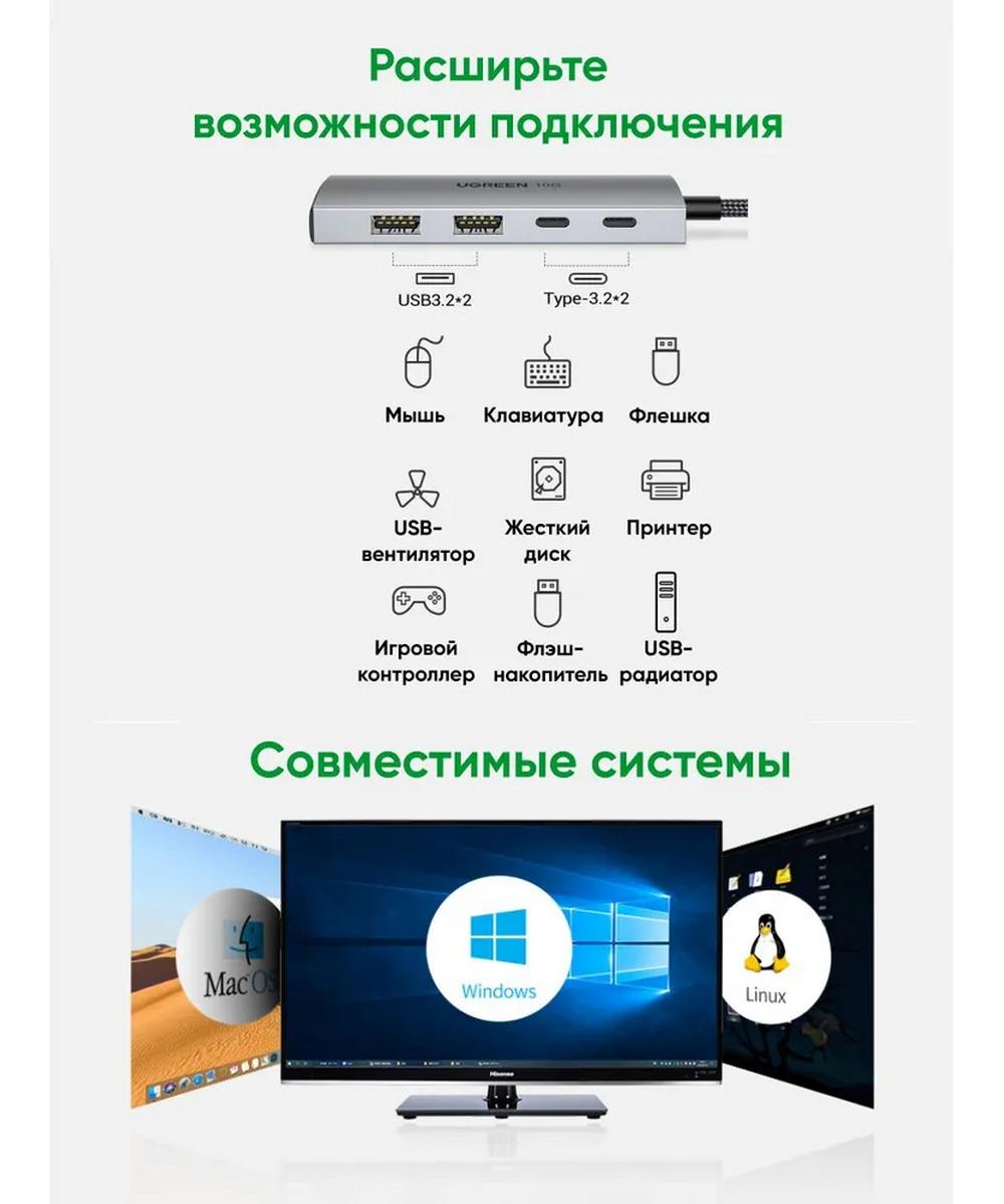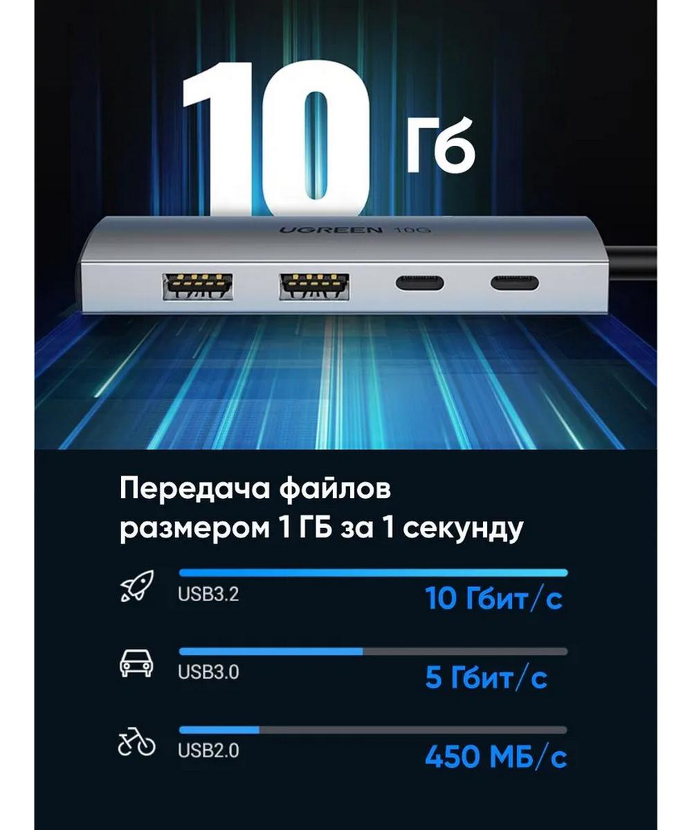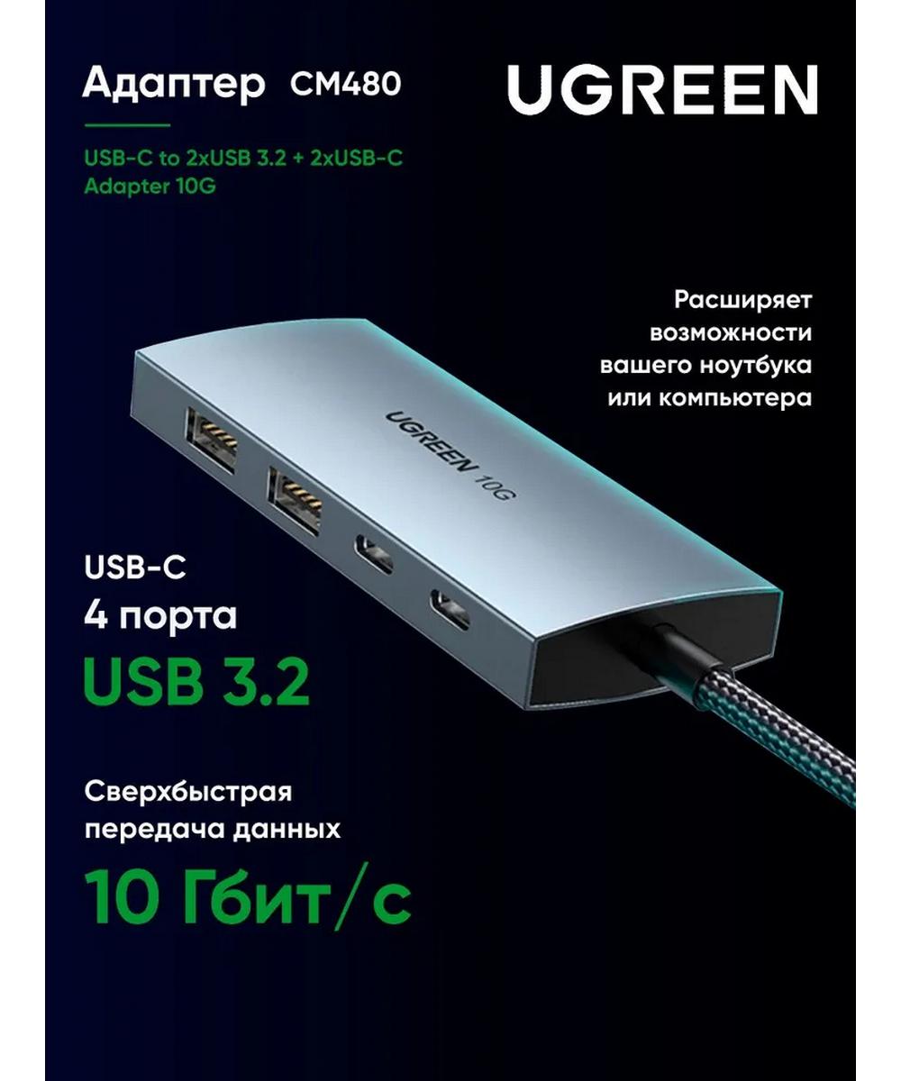Адаптер UGREEN CM480 (30758) USB-C to 2 х USB 3,1 + 2 х USB-C Adapter 10G - это высококачественный USB-концентратор, который обеспечивает быструю и стабильную передачу данных.