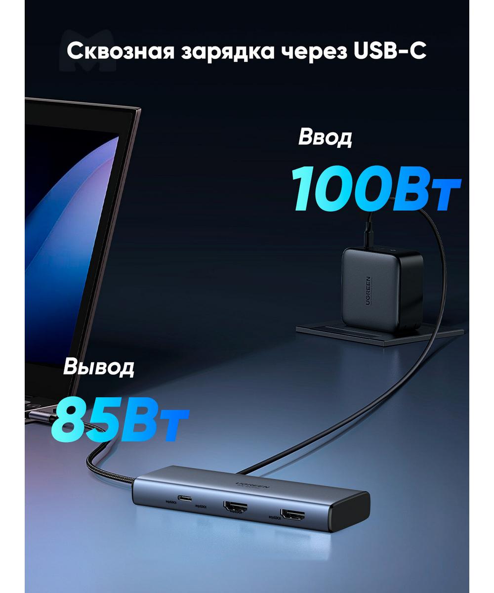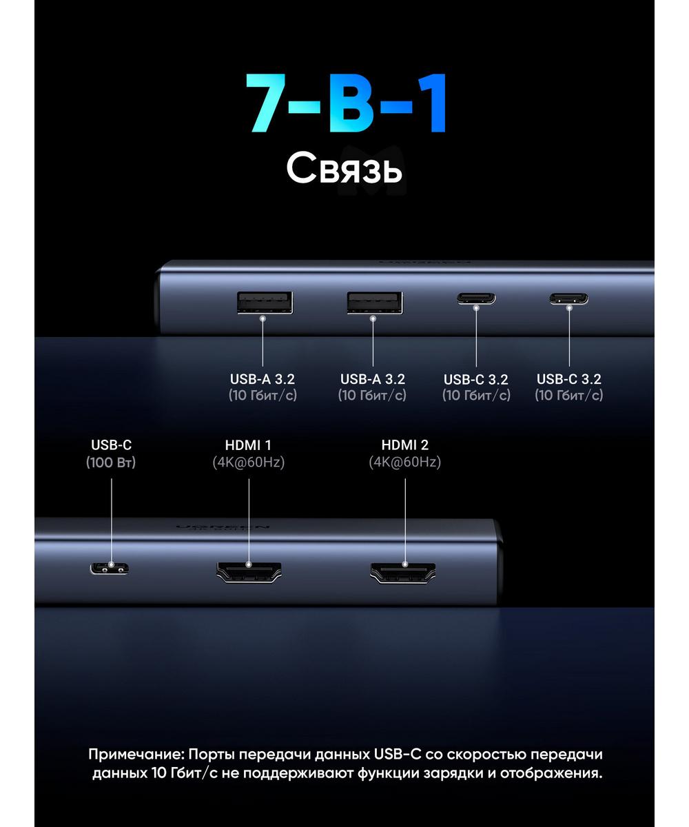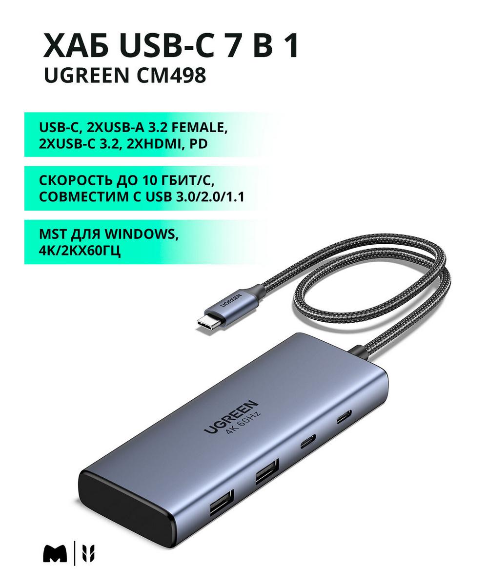 USB концентратор (хаб) UGREEN CM498 7 в 1: USB-C - 2хUSB-A 3.2, 2хUSB-C 3.2, 2хHDMI, PD, 4Kх60Гц, цвет серый (45379)