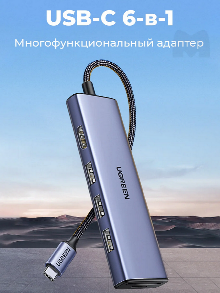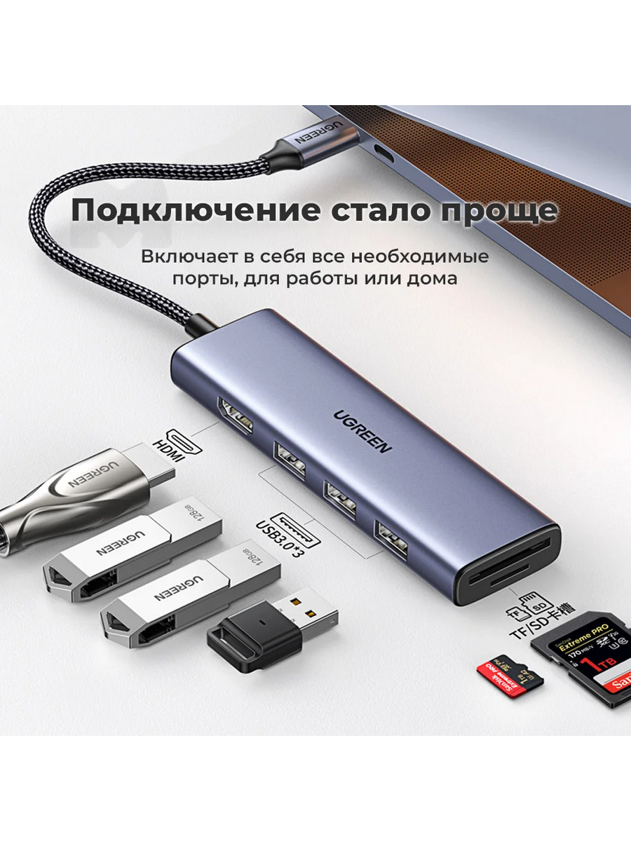 Хаб UGREEN CM511 позволяет расширить количество портов для подключения большего количества устройств. Концентратор данных UGREEN 6-в-1 USB-C оснащен выходным портом HDMI 4K, устройствами для чтения карт памяти SD и TF, а также 3 портами USB 3.0. И все порты концентратора могут работать одновременно.