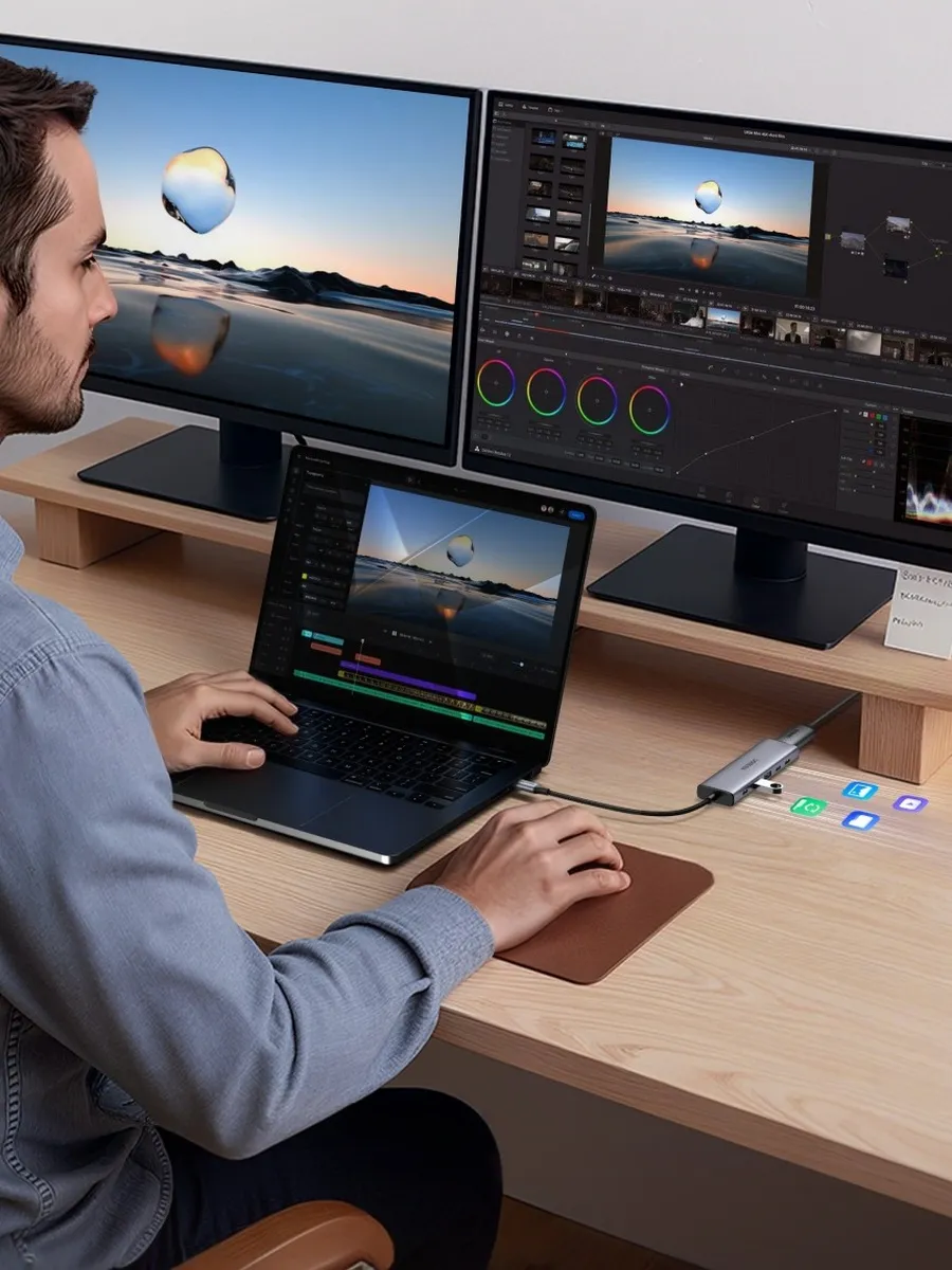 Превратите портативный компьютер в полноценную рабочую станцию с помощью компактной и мощной док-станции UGREEN CM511. Этот аксессуар, выполненный в элегантном сером цвете и прочном металлическом корпусе, станет идеальным центром управления для вашего устройства, обеспечивая все необходимые подключения через один единственный кабель.