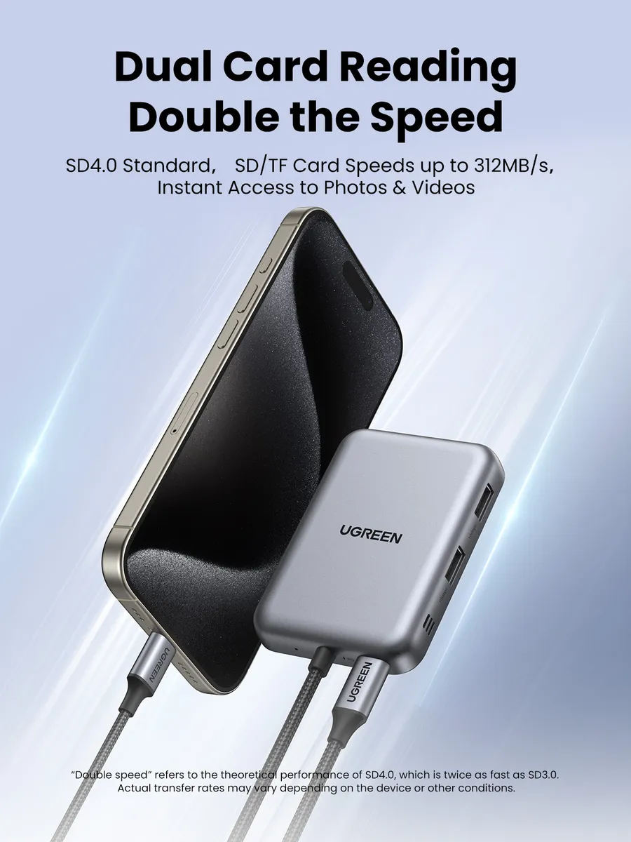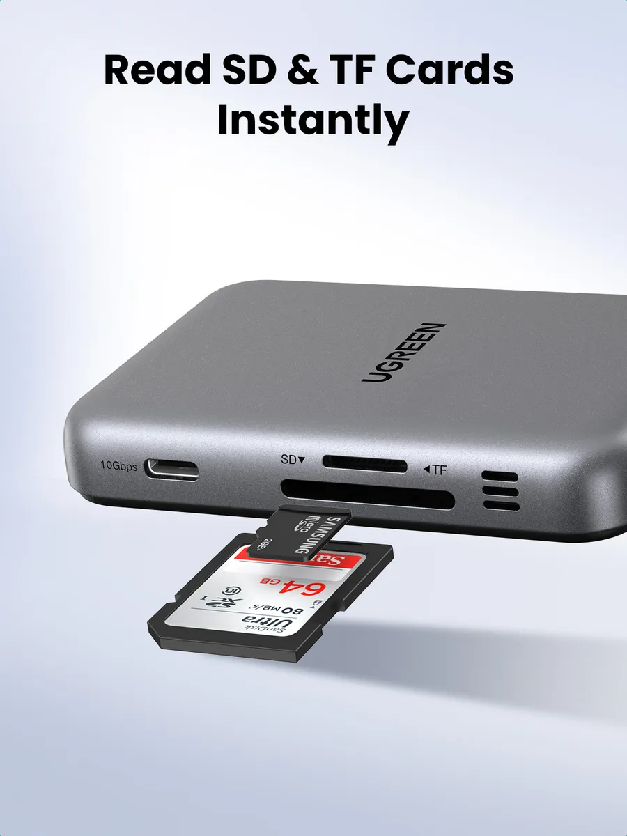 Хаб оснащен двумя слотами для USB-A и слотами для SD и TF-карт. Это позволяет одновременно подключать различные устройства и карты памяти, что делает его незаменимым аксессуаром для работы и развлечений.