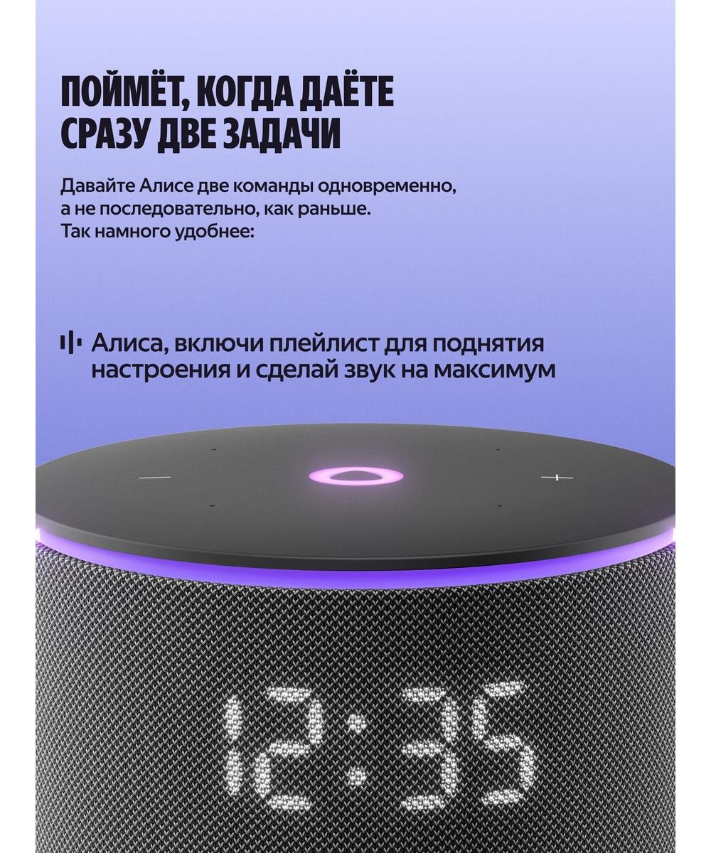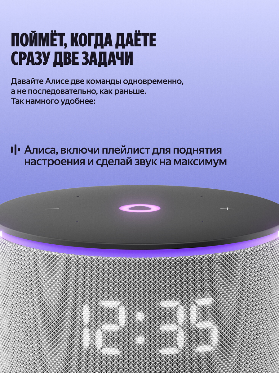 Алиса с искусственным интеллектом в Станции Мини 3 Про умеет так много: она найдёт и включит, что попросите — музыку, аудиокниги, подкасты — и подберёт рекомендации по вашим интересам. Задавайте самые разные вопросы и получайте понятные и подробные ответы. Можете даже давать ей сразу несколько команд — Алиса поймёт их и выполнит, например: «Алиса, включи плейлист для поднятия настроения и сделай звук на максимум».