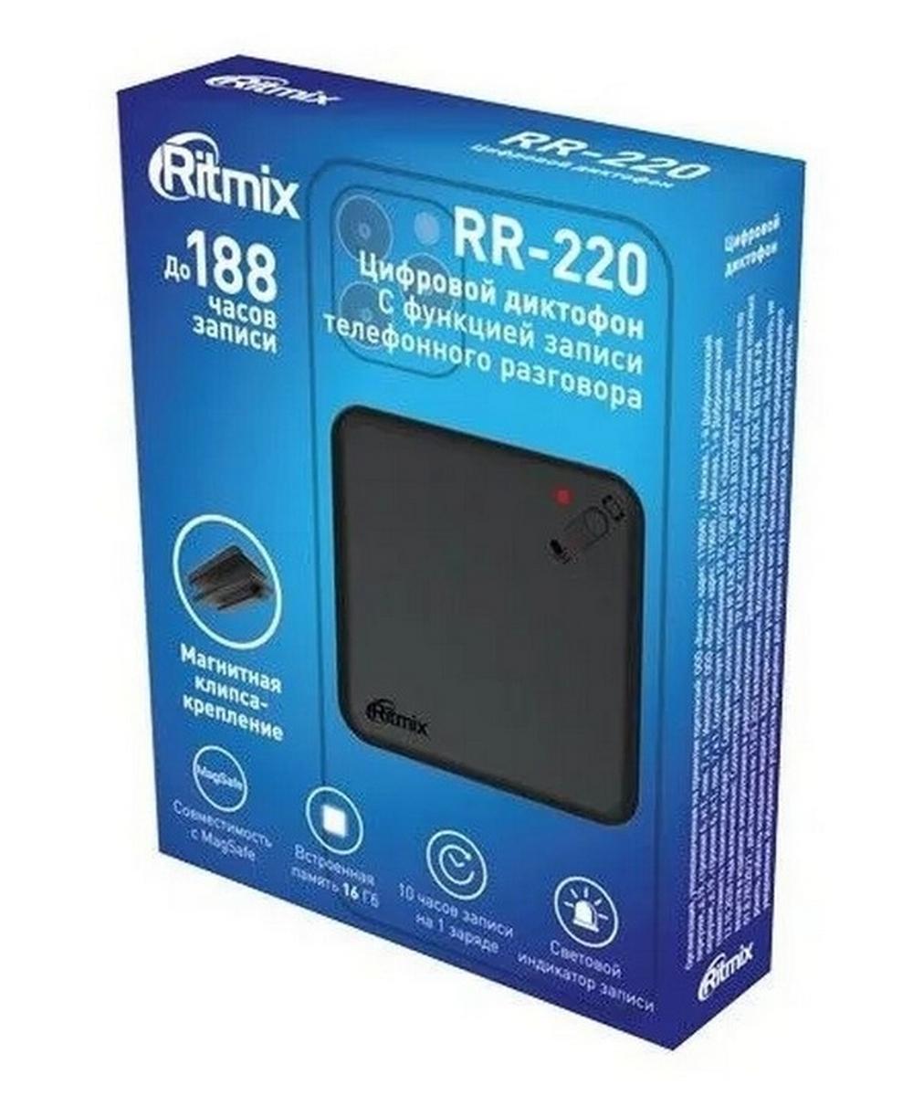 Записывайте важные моменты жизни с помощью компактного диктофона Ritmix RR-220. Этот небольшой, легкий (40 грамм) прибор черного цвета легко поместится в кармане или сумке, а благодаря габаритам 60x60x8,3 мм, он практически незаметен. В комплекте идет удобное крепление-клипса и магнитное кольцо для фиксации.