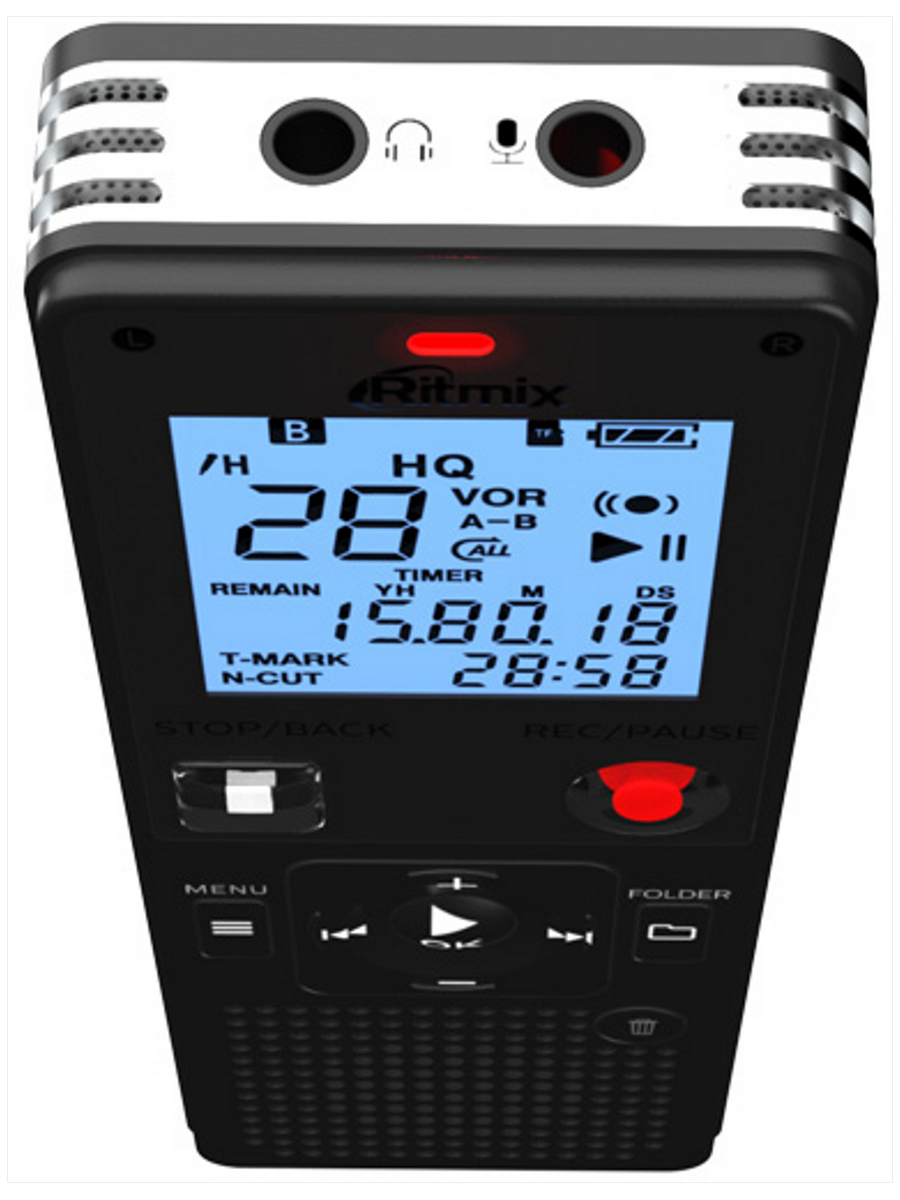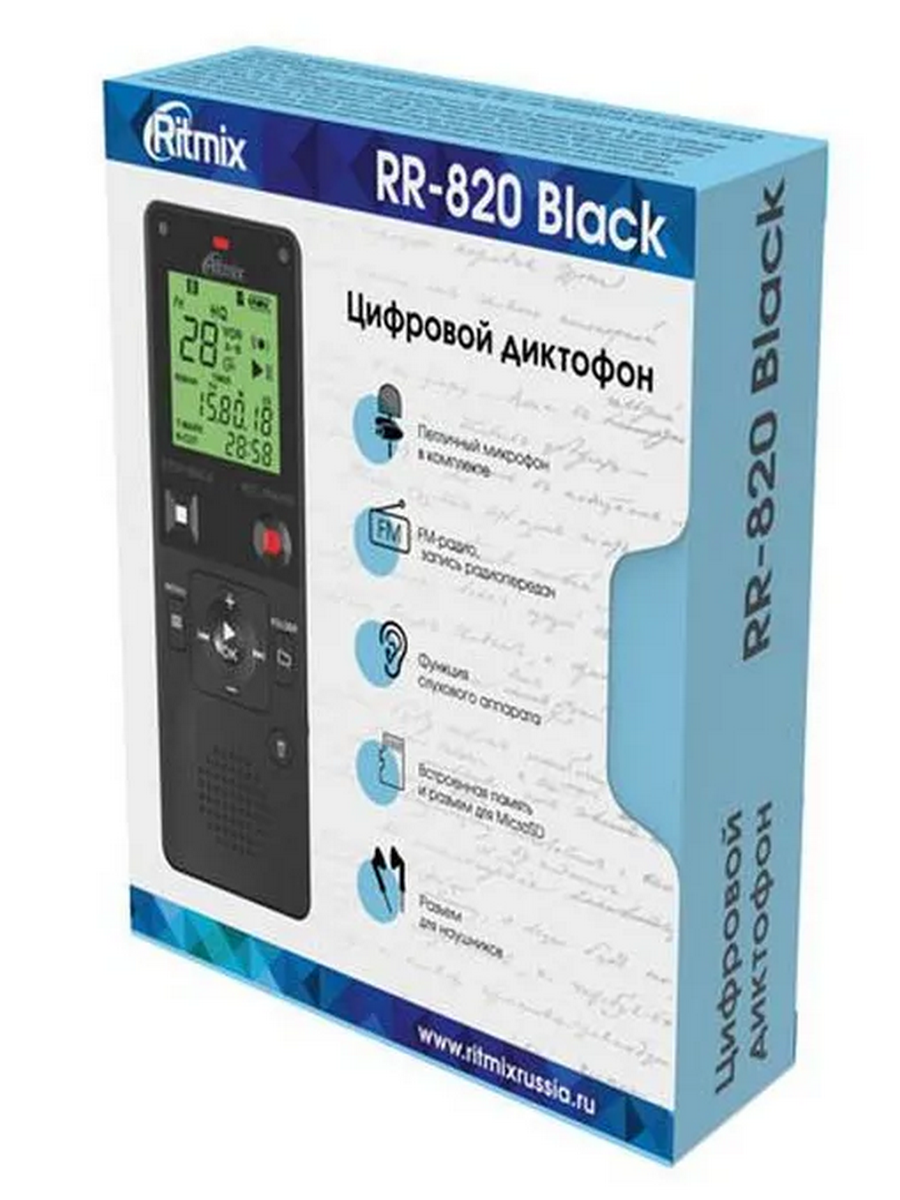 Ritmix RR-820 - компактный цифровой диктофон для записи с функцией аудиоплеера, 2 встроенных высококачественных микрофона, стерео запись и разъём для внешнего микрофона. Максимальный объем подключения носителя памяти (слот для карты памяти) 32 гб. Дополнительно петличный микрофон в комплекте. Встроенная память 8 ГБ до 40 часов в режиме HP , до 55 часов в режиме SP, до 50 часов в режиме LP. Диктофон мини оборудован разъемом для наушников 3,5мм. Этот же разъем можно использовать для внешнего микрофона. Порт для подключения к компьютеру гнездо Micro-USB тип B. Диктофон для записи мини работает от 2 батареек тип ААА (в комплект не входят). Поддерживаемые аудиоформаты APE, MP3, WMA, FLAC, WAV. Диктофон для записи с аудиоплеером . Превосходное качество записи.
