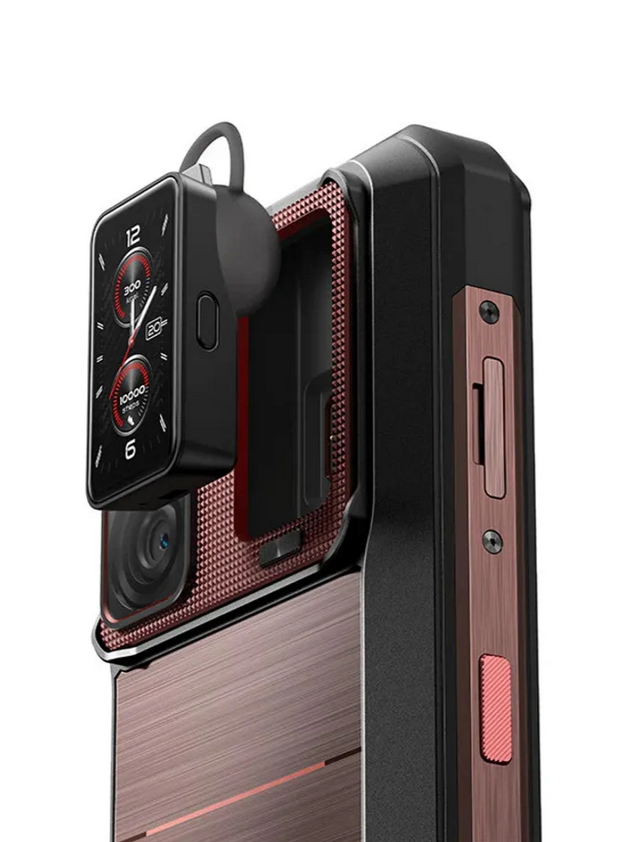 Главная особенность Oukitel WP300 — прямоугольный разъем справа от блока камер, в который встроен небольшой фитнес-браслет со встроенной гарнитурой. Когда аксессуар находится внутри смартфона, он отображает только время. Если же вынуть браслет и надеть его на запястье, он начинает считать шаги, измерять пульс, уровень кислорода в крови и другие параметры здоровья. Заряжается браслет напрямую от батареи смартфона.