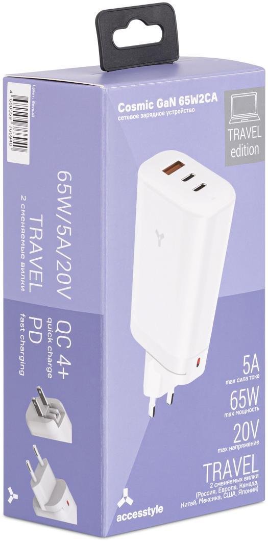 Cosmic GaN 65W2CA Travel — модель, в основе которой используется нитрид галлия (GaN). По сравнению с привычными зарядными устройствами, созданными на основе кремния, такие устройства отличаются небольшим размером и высокой мощностью, имеют более высокую энергоэффективность, а значит стойкость к высоким температурам и способность выдерживать более высокое напряжение.
