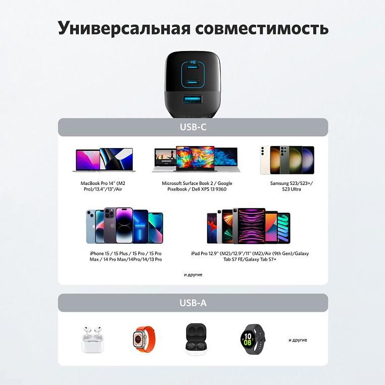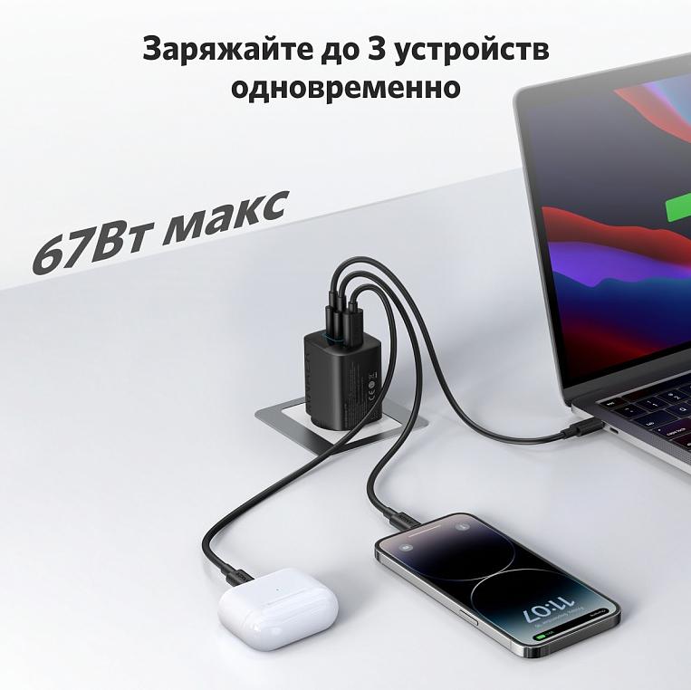 Зарядка 3 устройств одновременно: 2 порта USB-C и один порт USB-A позволяют заряжать телефон, планшет и ноутбук одновременно от одного зарядного устройства. Подключите одно устройство для зарядки мощностью до 67 Вт.
