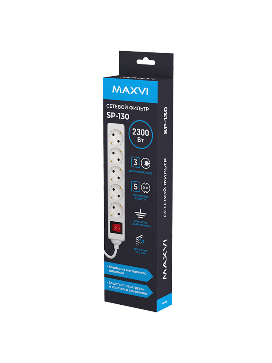 Сетевой фильтр MAXVI SP-130 — надежное и удобное решение для подключения сразу нескольких электрических приборов. Он оснащён пятью евро-розетками (тип F) с заземлением и общим выключателем с подсветкой, что позволяет одним нажатием отключить питание всех устройств.