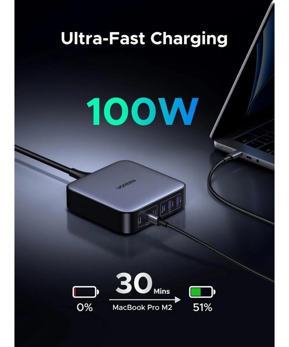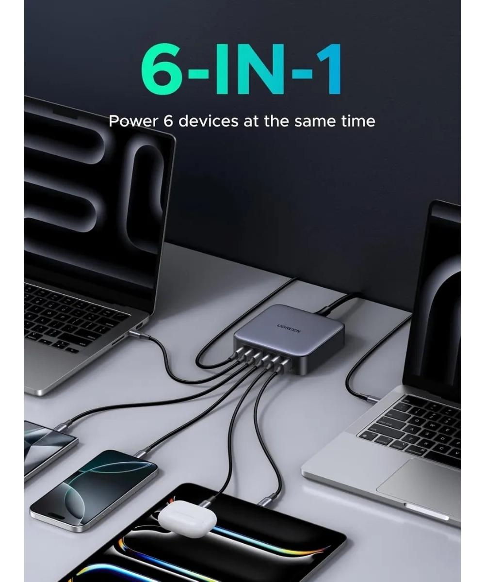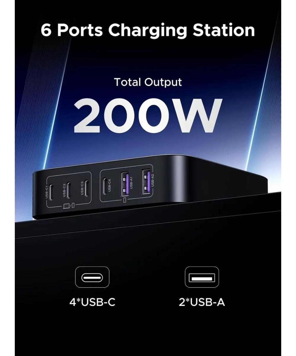 Это мощное зарядное устройство обеспечивает быструю зарядку — например, полностью заряжает крупный ноутбук всего за полтора часа. Благодаря современному чипу нового поколения зарядка происходит в три раза быстрее по сравнению со стандартными адаптерами. Устройство оснащено шестью портами и способно одновременно заряжать до трёх ноутбуков, двух смартфонов и наушники, обеспечивая общую мощность до 200 Вт и помогая поддерживать порядок на рабочем столе.
