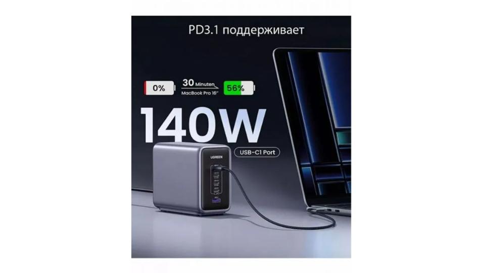 Зарядка мощностью 300 Вт с поддержкой скорости зарядки PD 3.1 обеспечивает максимальную выходную мощность до 140 Вт для USB-C1 и может заряжать MacBook Pro 2021-2024 годов 16 дюймов с 0% до 56% за 30 минут. При одновременном использовании USB C1 & C2 & C3 можно достичь максимальной мощности 300 Вт (140 Вт + 100 Вт + 60 Вт).