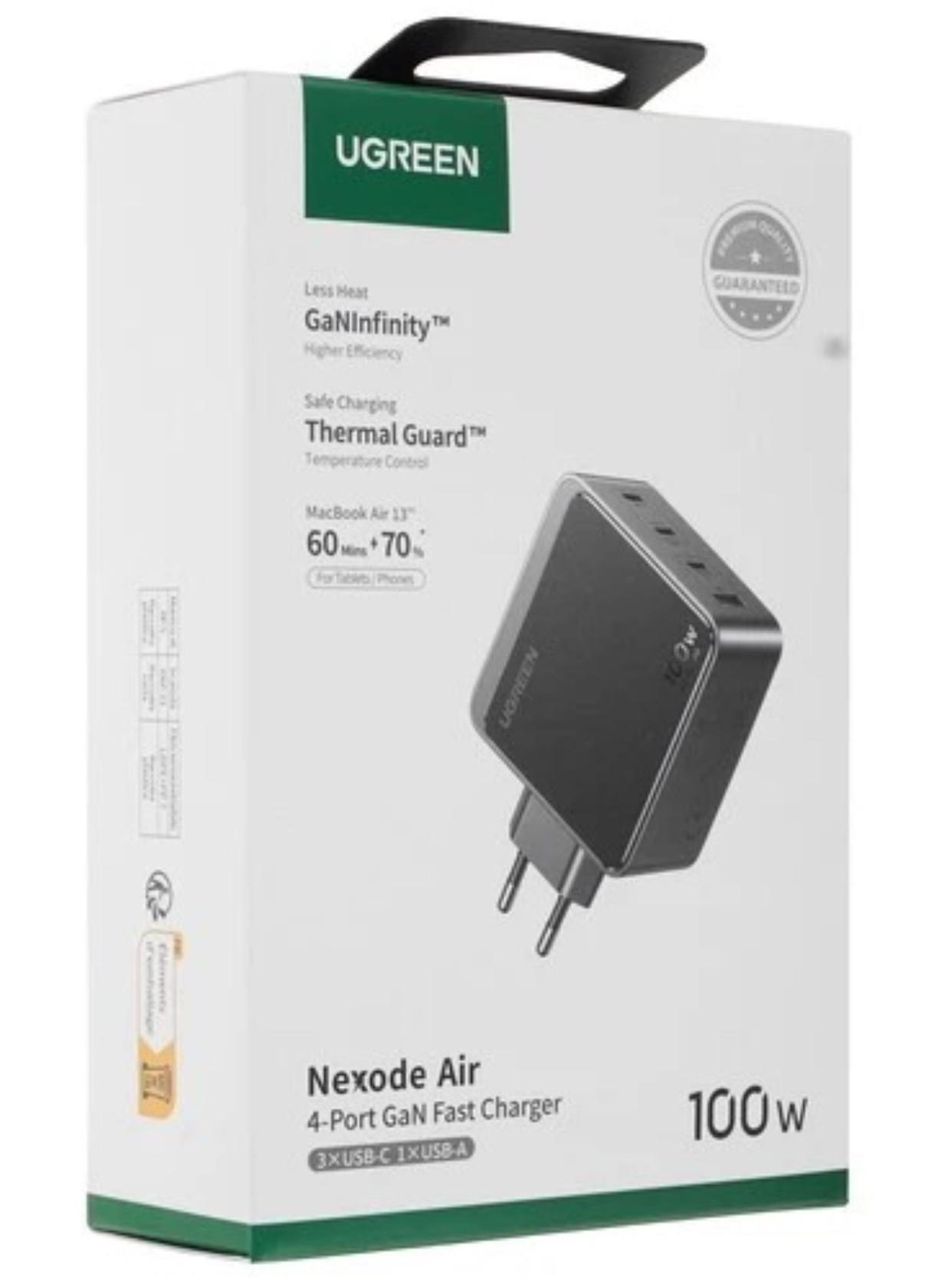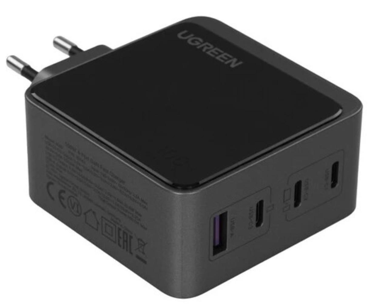 Адаптер UGREEN 100W,с мощной технологией GaN, имеет меньший размер, но более высокую мощность. Вы можете одновременно заряжать 4 устройства на полной скорости и экономить массу времени благодаря высокой мощности устройства UGREEN 100 Вт. Все порты поддерживают быструю зарядку QC. Бери одно зарядное устройство, а заряжай сразу 4!