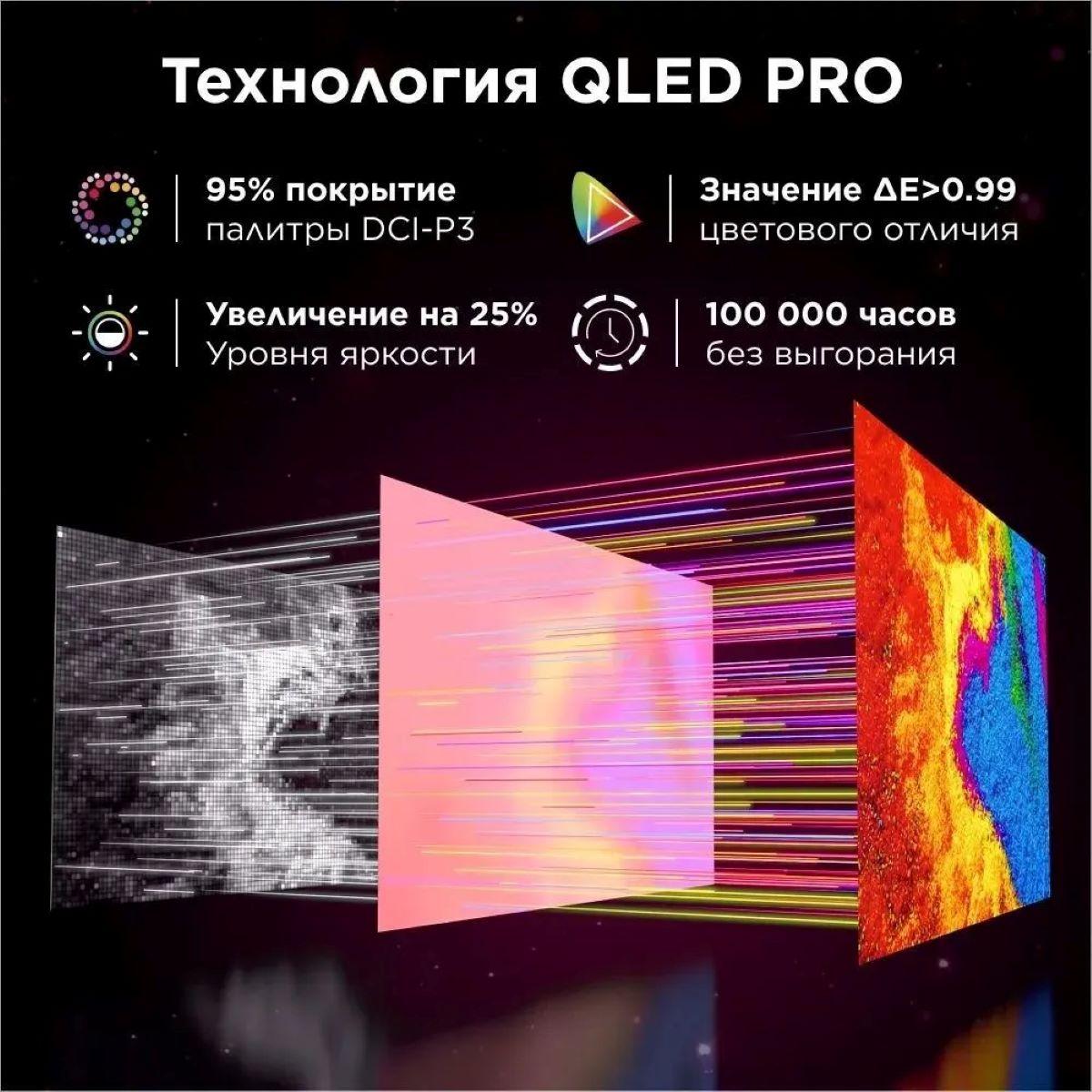 Телевизор имеет большую диагональ 65 дюймов (165 см), которая подойдет для просмотра с расстояния 2,5-5 метров. Высокое разрешение 4K Ultra HD (3840x2160 пикселей) обеспечивает четкость и детализацию изображения. Матрица QLED предлагает отличную контрастность 6000:1 и высокую пиковую яркость 450 кд/м2, что обеспечивает насыщенность цветов. Полный угол обзора 178° исключает искажение при боковом просмотре.