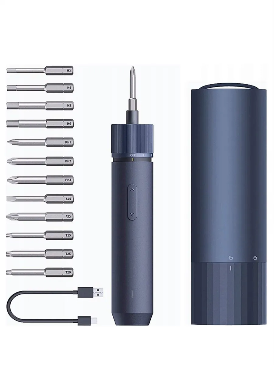 Отвертка аккумуляторная Hoto QWLSD001 (HTE0001GL) с набором из 12бит из стали S2 и тубусом для хранения. Верхняя часть корпуса изготовлена измягкой искусственной резины с нескользящей фактурой, авнутренняя— изударопрочного полимерного материала. Инновационный чип гарантирует точность регулировки крутящего момента. Патрон с магнитным держателем исветодиодной подсветкой, которая загорается автоматически при использовании отвертки. Емкость аккумулятора 1500мАч, одного заряда хватает на1000закручиваний. Время зарядки через разъем USB Type-C составляет 2.5часа.