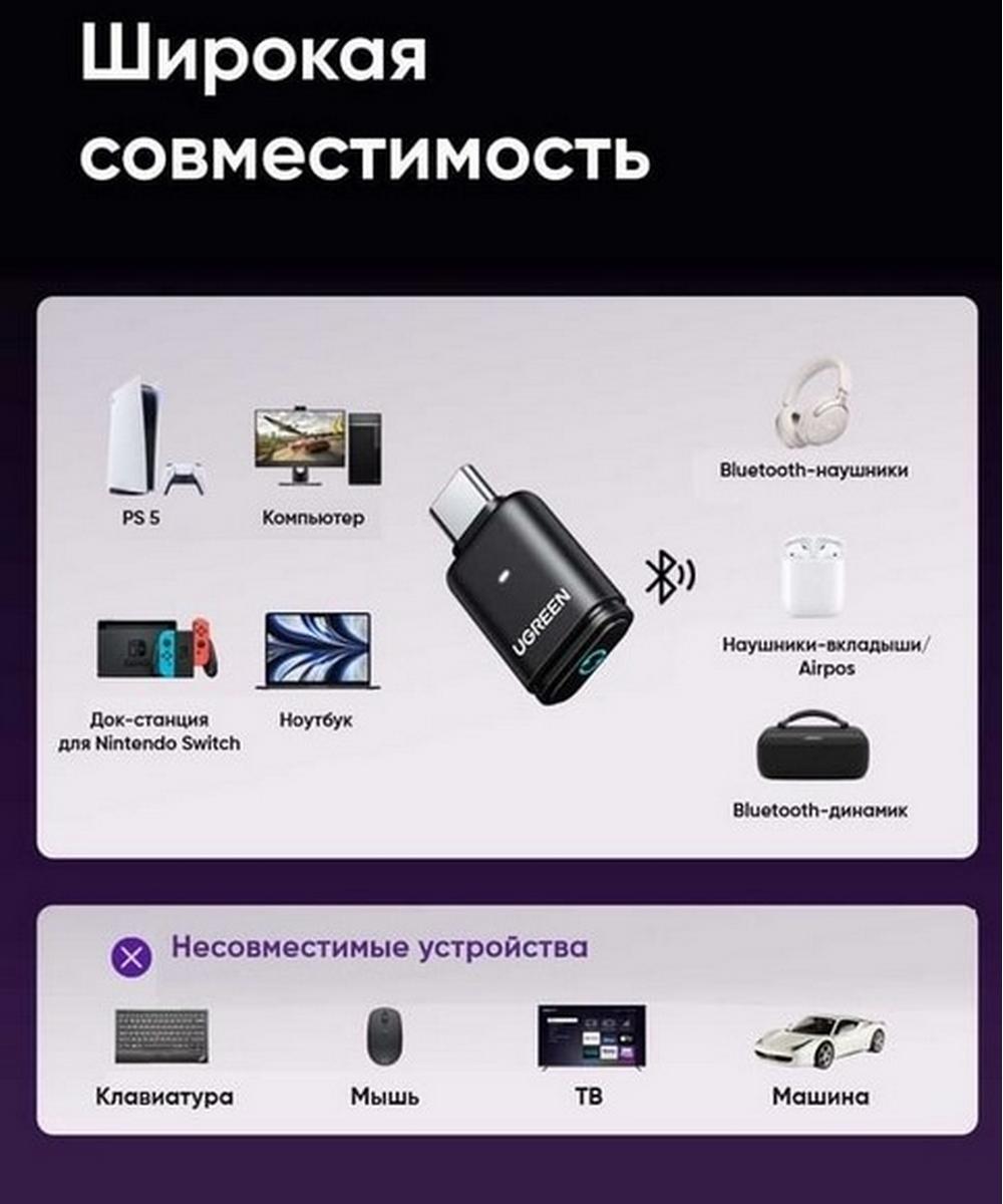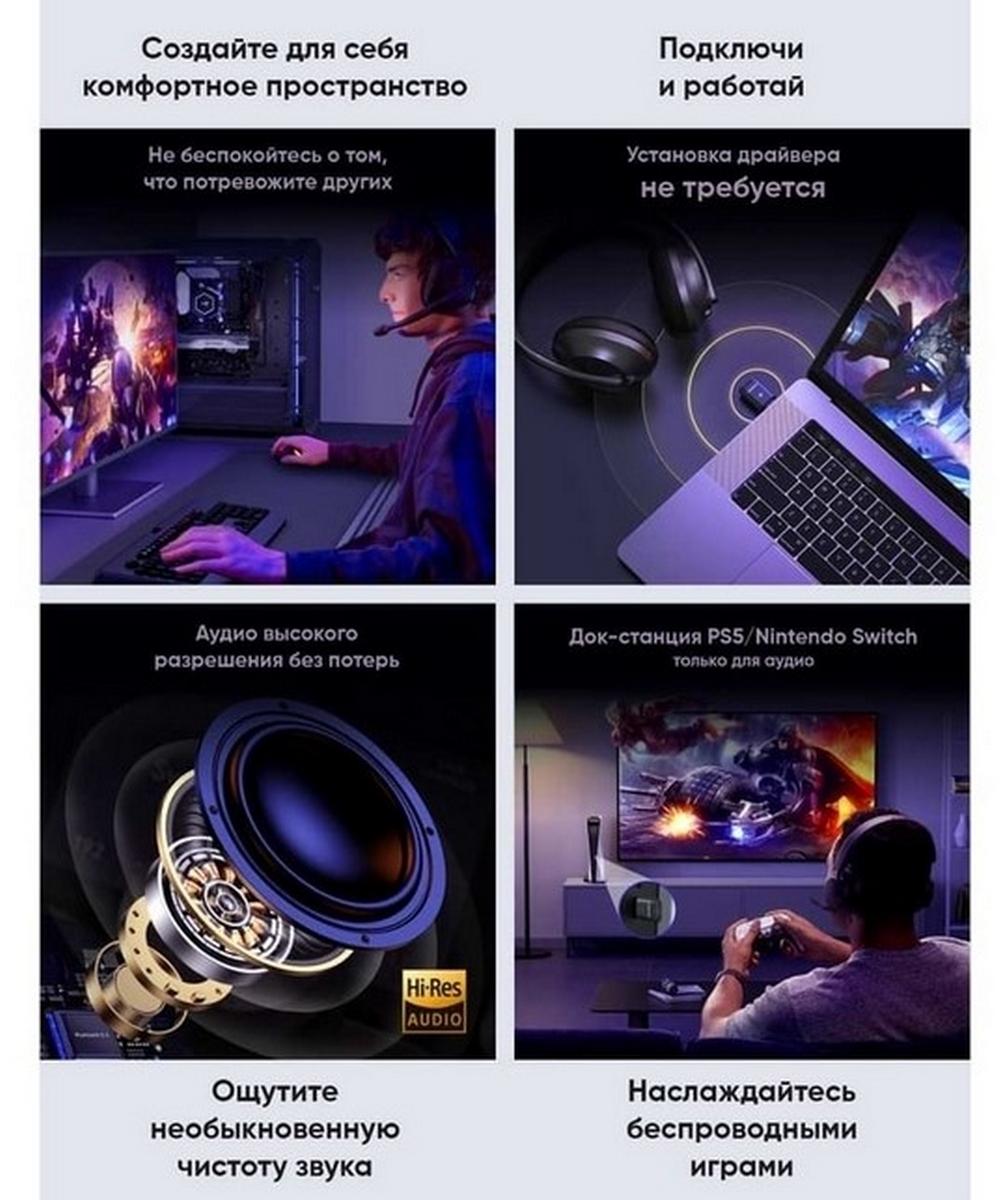 Беспроводной Bluetooth-адаптер с USB-C для передачи звука на наушники или колонки. Подключается к компьютеру, PlayStation 5 или Nintendo Switch, превращая их в беспроводные аудиоустройства. Поддержка высококачественного звука 24 бит/96 кГц с минимальными задержками благодаря Bluetooth 5.3. Совместим с популярными аудиокодеками, включая aptX HD и Adaptive для чёткого звучания без помех. Радиус действия до 10 метров, удобное компактное исполнение. Простое подключение — вставили в USB-C порт и сразу можно пользоваться. Отличное решение для игр, просмотра фильмов и прослушивания музыки без проводов.
