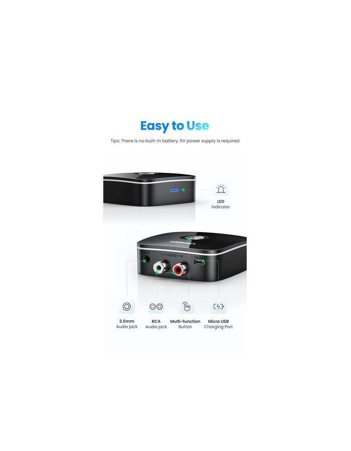 Не нужно тянуть провода к колонкам через всю комнату. Подключите к наушникам или колонкам этот адаптер и передавайте на них звук по Bluetooth. Встроенный кодек aptX обеспечивает приятное прослушивание без задержек. Корпус адаптера сделан из пластика. Размеры 5,4х1,37 см – помещается в ладонь. Сверху на корпусе есть кнопка управления. На переднем торце – порт для зарядки и аудиоразъемы (3,5 мм и 2RCA). На заднем торце – LED-индикатор. Внизу прорезиненное кольцо-подставка, чтобы ресивер не скользил по столу.