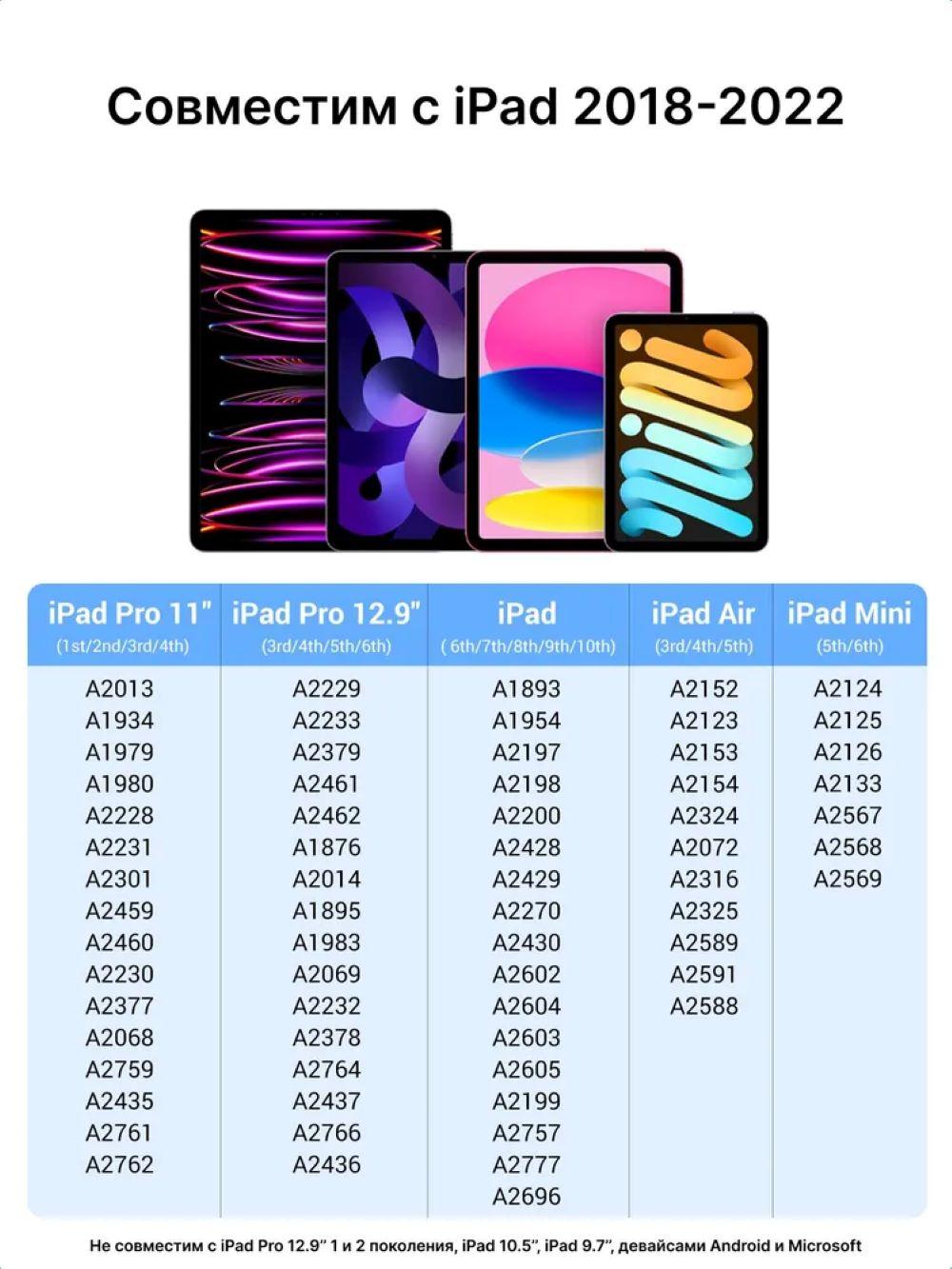 Совместимость: подходит для iPad 2018-2022. iPad Pro 12.9" (3, 4 5 поколение), iPad Pro 11" (1,2,3 поколение), iPad Air (3, 4 и 5 поколение) iPad (6, 7, 8, 9 поколение), iPad mini (5 и 6 поколения). НЕ совместим c планшетами Samsung, iPhone, устройствами на Microsoft