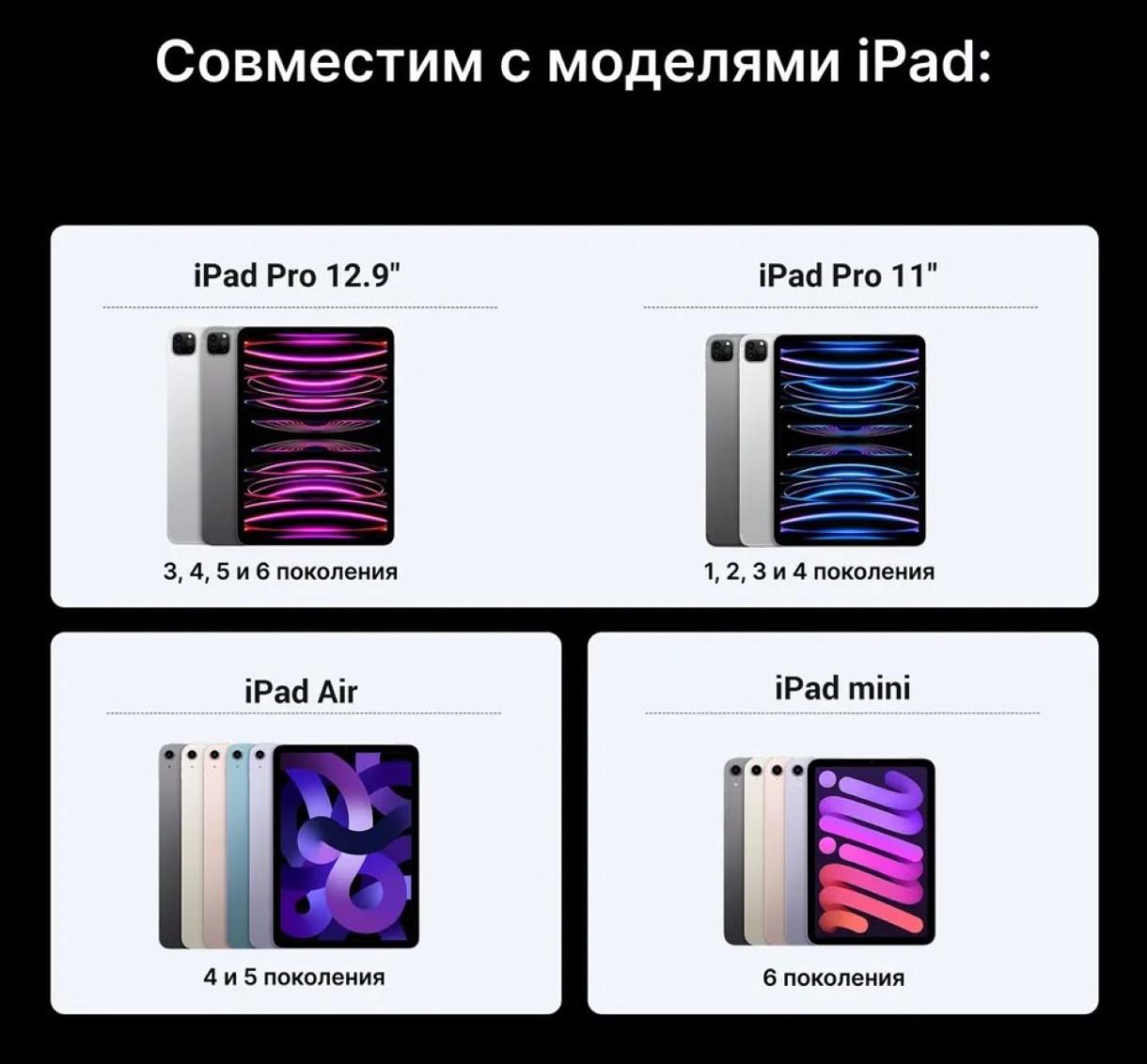 Совместимость: iPad Pro 12.9-inch (6th generation), iPad Pro 12.9-inch (5th generation), iPad Pro 12.9-inch (4th generation), iPad Pro 12.9-inch (3rd generation), iPad Pro 11-inch (4th generation), iPad Pro 11-inch (3rd generation), iPad Pro 11-inch (2nd generation), iPad Pro 11-inch (1st generation), iPad Air (5th generation), iPad Air (4th generation), iPad mini (6th generation).