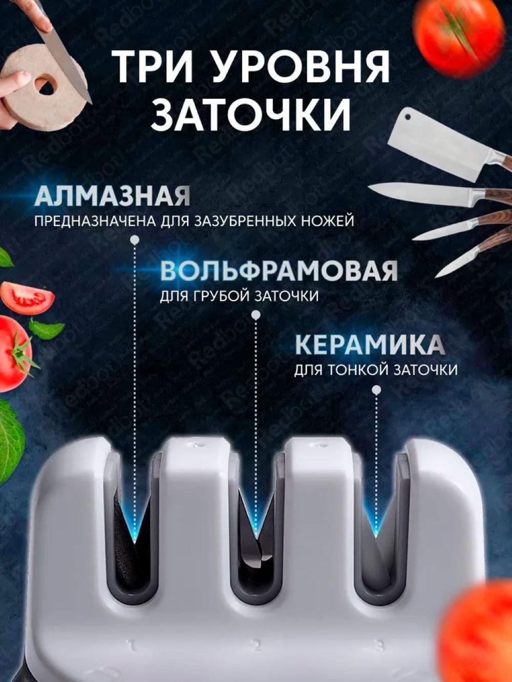 Для тонкой шлифовки у точилки для ножей имеется третий разъём, где установлены керамический камни для заточки. Сделав несколько движений лезвием, и заточка ножа будет завершена. Теперь ваш кухонный инструмент режет как новый, и даже лучше.