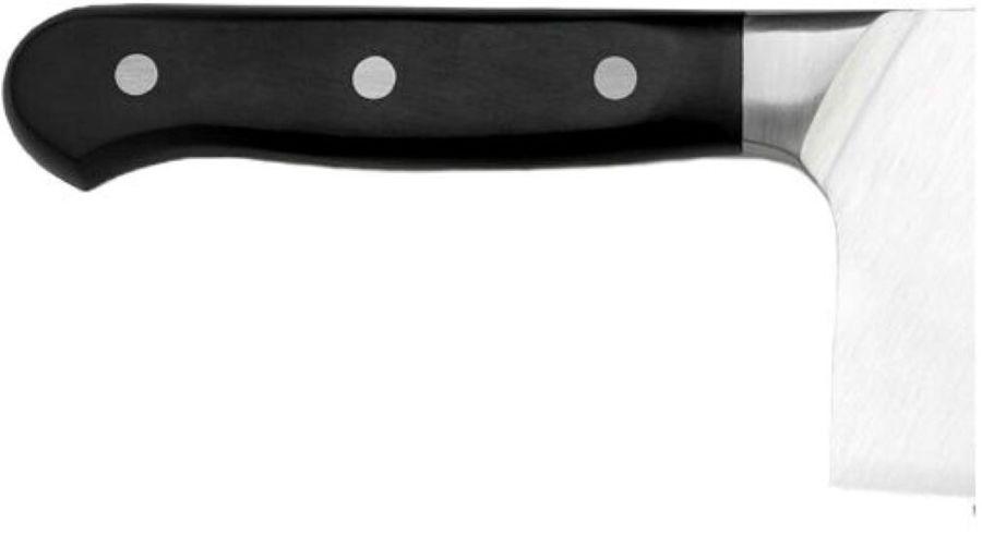 От традиционно используемых ножей отличается более широкой и толстой рабочей поверхностью, что дает возможность рубить хрящи и кости толщиной до 3,5 мм, особо твердые и замороженные продукты.
