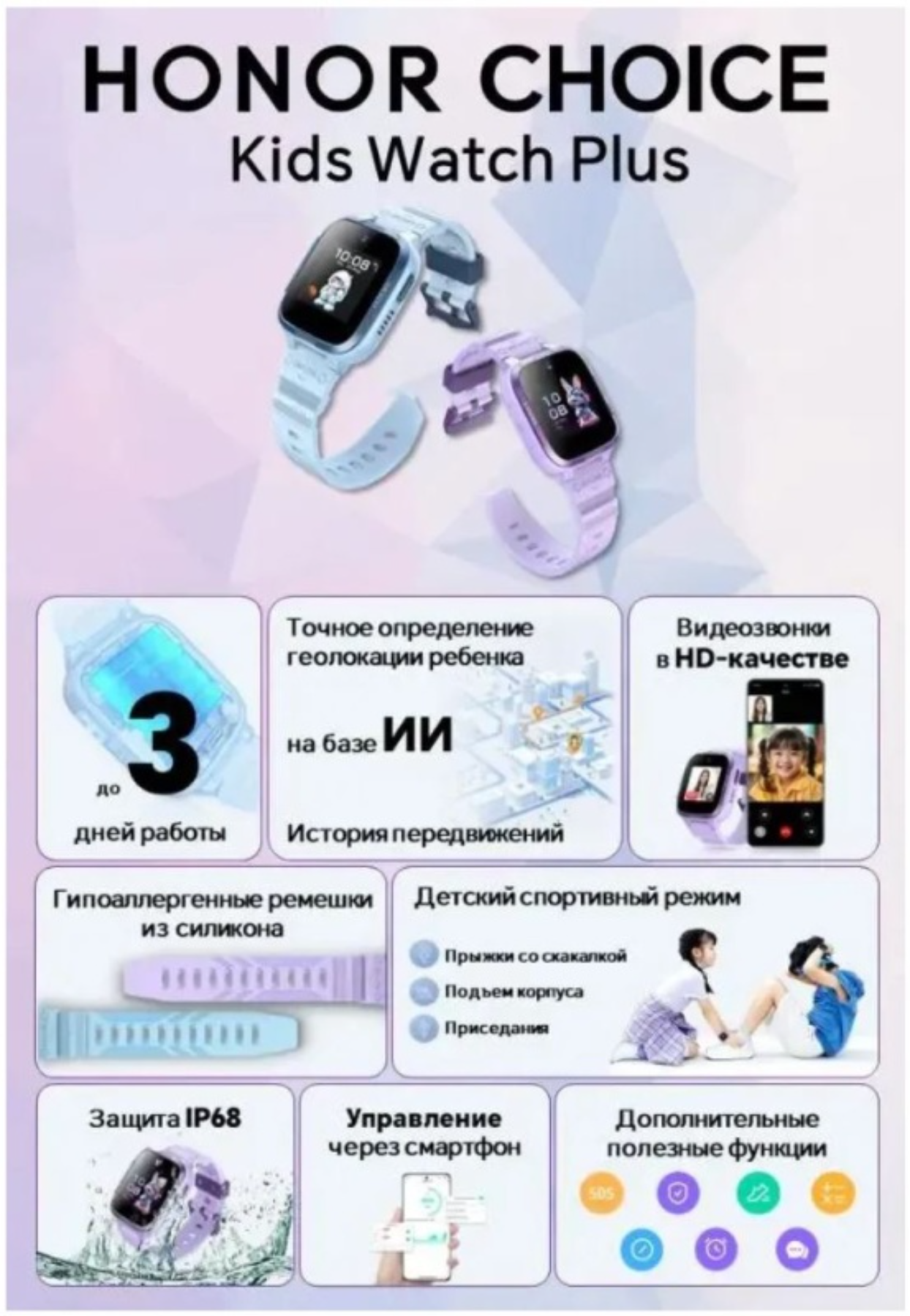 Детские часы HONOR Choice Kids Watch 4G – возможность связаться с ребенком в любой момент. Устройство в стильном цвете будет хорошо смотреться на детской руке благодаря небольшому размеру корпуса, в который заключен 1.3-дюймовый дисплей. Силиконовый ремешок не боится влаги и абсолютно безопасен для кожи на запястье. Легкий корпус из пластика обладает степенью защиты IP68. За счет ее наличия устройство не выйдет из строя, если ребенок попадет под дождь.