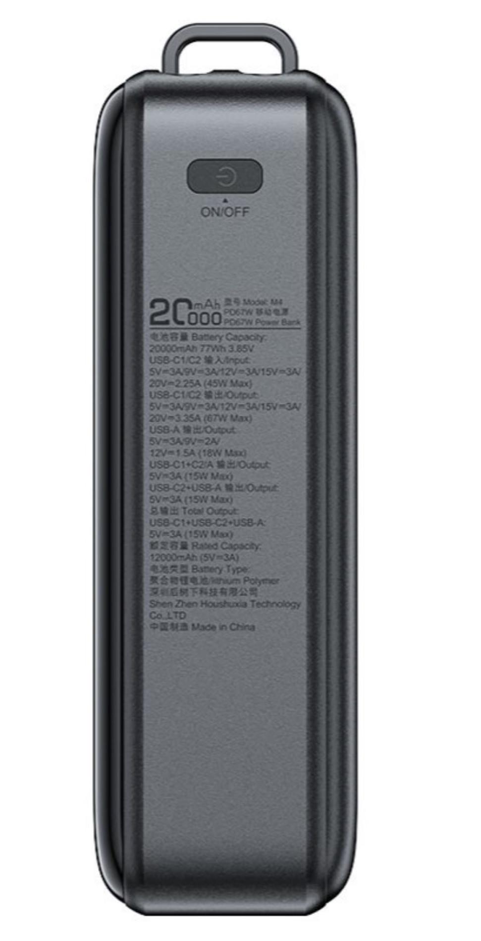 На корпусе устройства имеются 2 разъема USB Type-C (In/Out) и один USB (Out). Таким образом, вы сможете заряжать 2 устройства одновременно. Мощность зарядки может достигать при этом 67 Вт. Аккумулятор поддерживает множество протоколов зарядки, включая PPS, 5V2A, DCP, QC2.0, QC3.0, QC4+, AFC, FCP, SCP, PD2.0 и PD3.0. Он невероятно компактен, поэтому легко поместится в любой сумке и вы без проблем сможете взять его с собой в поездку или путешествие. Он выручит вас, когда вашему смартфону или другому устройству будет необходимо пополнить запас энергии, а розетки рядом нет. Емкость внешнего аккумулятора равна 20000 мАч.