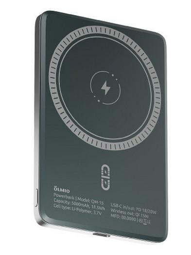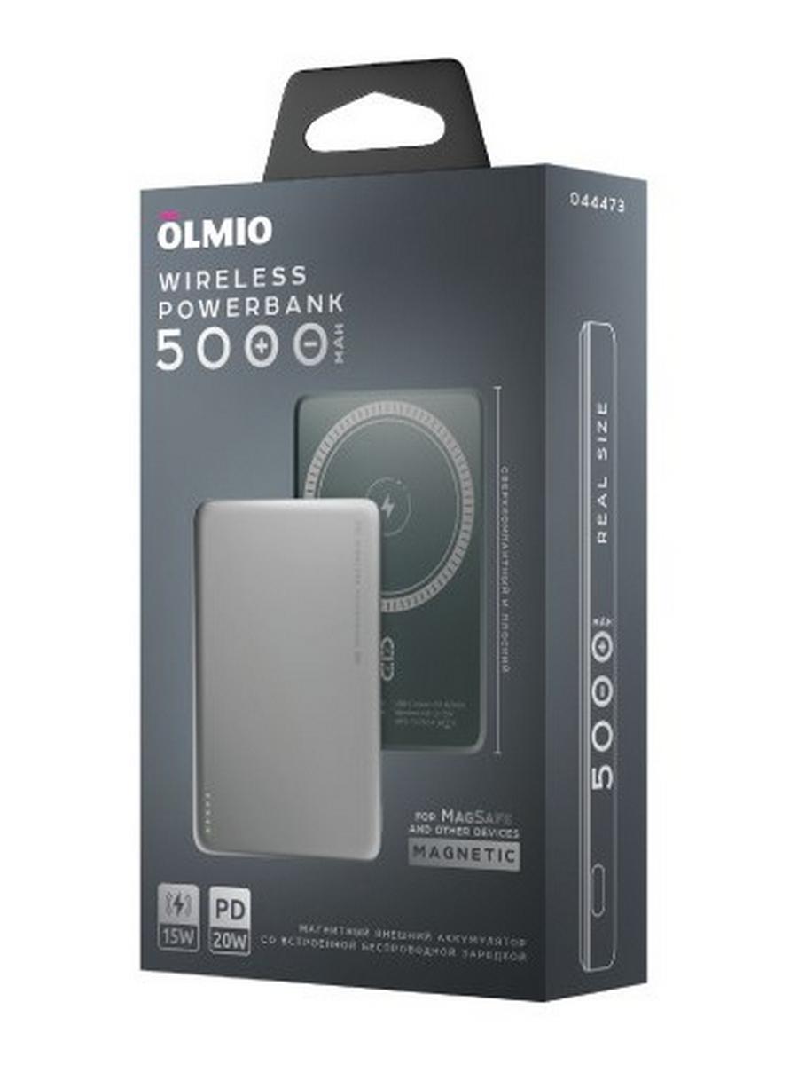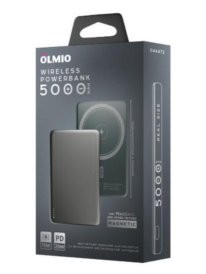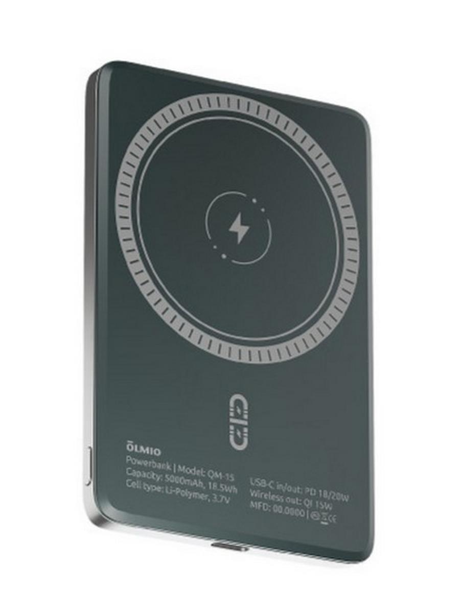 Магнитный внешний аккумулятор Olmio QM-06 емкостью 5000 мАч с функцией быстрой беспроводной зарядки по стандарту Qi. Совместим с устройствами Apple iPhone 12, 13, 14, 15, 16 всех моделей, а также с другими смартфонами, поддерживающими беспроводную зарядку.