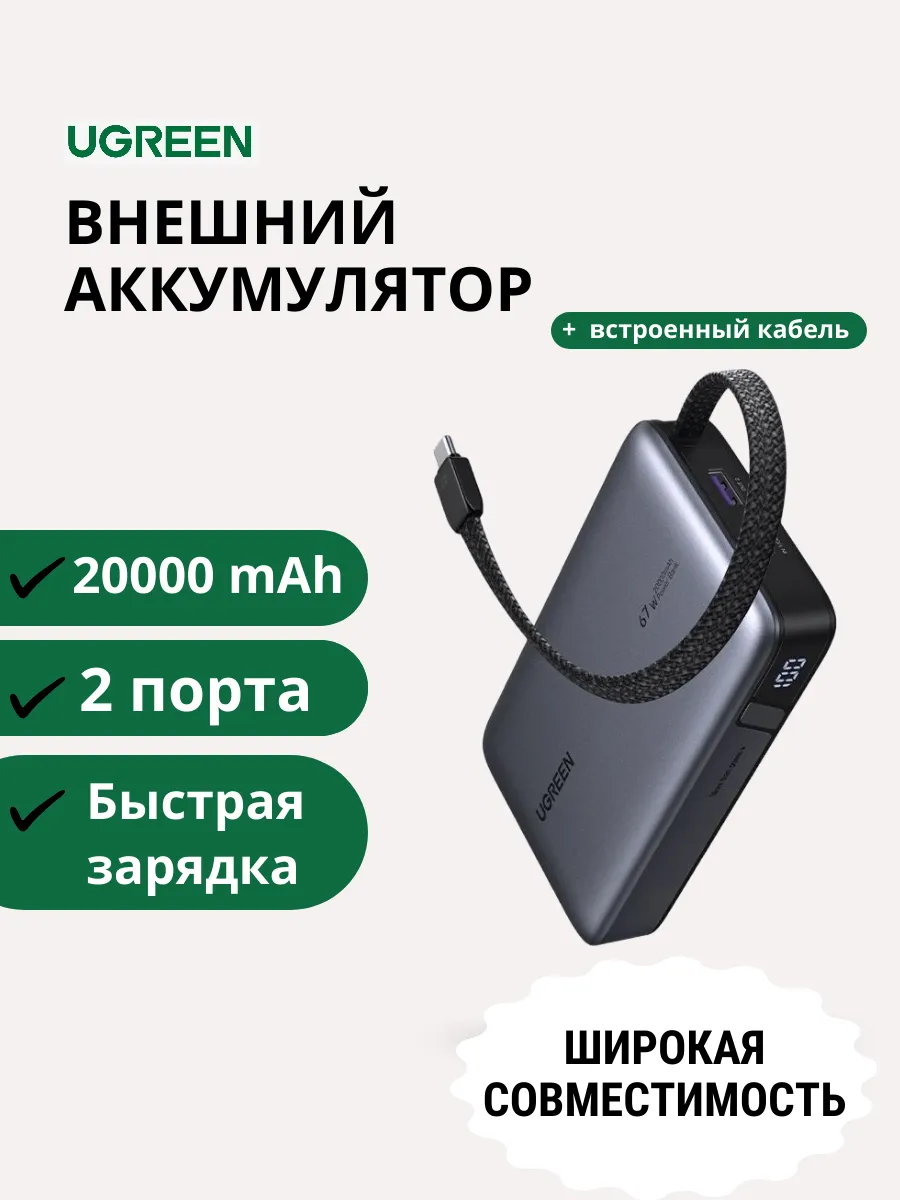 Внешний аккумулятор Ugreen PB550 PD емкостью 20000 mAh оснащен 2 разъемами Type-C + USB-A + встроенным кабелем, что позволяет подключить к нему одновременно до 3 устройств и не беспокоиться об их безопасности. Встроенная защита эффективно предотвращает их повреждение. Интеллектуальная система определяет тип подключенного устройства и автоматически регулирует силу тока и напряжения. Полная защита как аксессуара, так и заряжаемых устройств от перезарядки, перегрева и коротких замыканий.