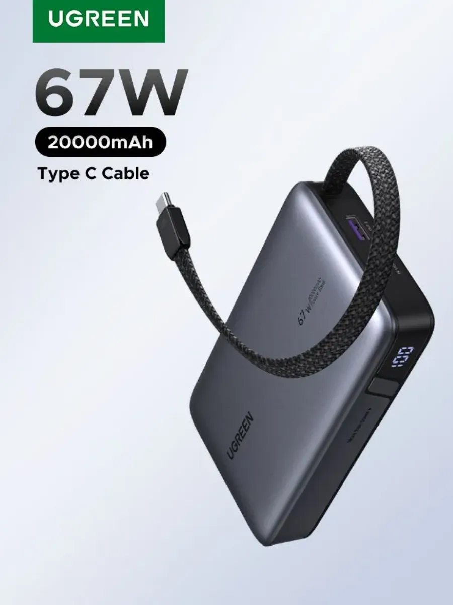 Повербанк мощностью 67Вт. На корпусе расположен дисплей, по которому можно определить на сколько заряжен аккумулятор.