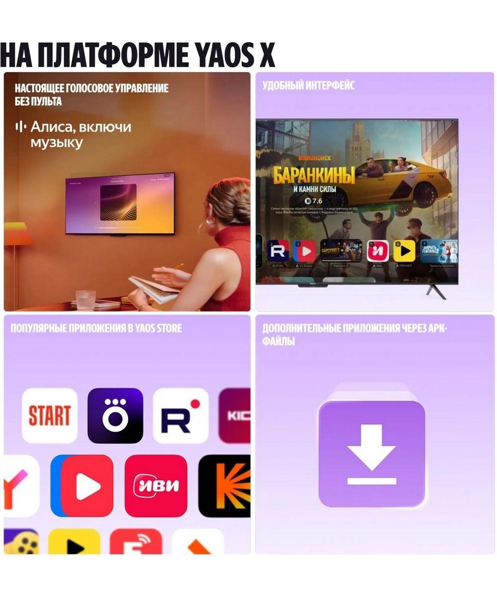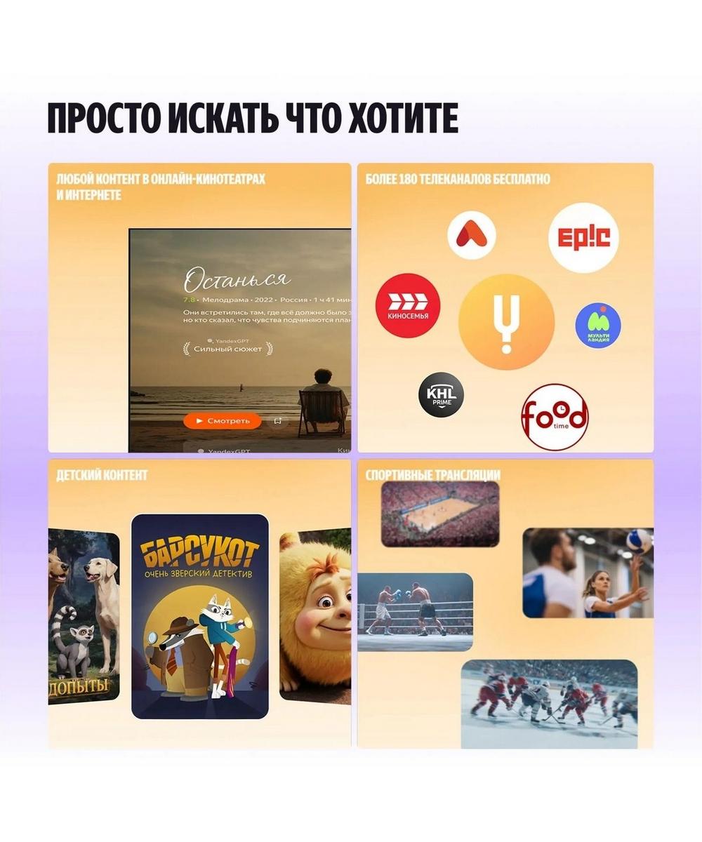 Телевизор с Алисой обрабатывает голосовые команды, отвечает на вопросы и помогает в играх, анализируя происходящее на экране. Алиса учитывает контекст диалога и предоставляет релевантные ответы. Голосовое управление работает в самых популярных приложениях — RUTUBE, Иви, Wink, VK Видео.