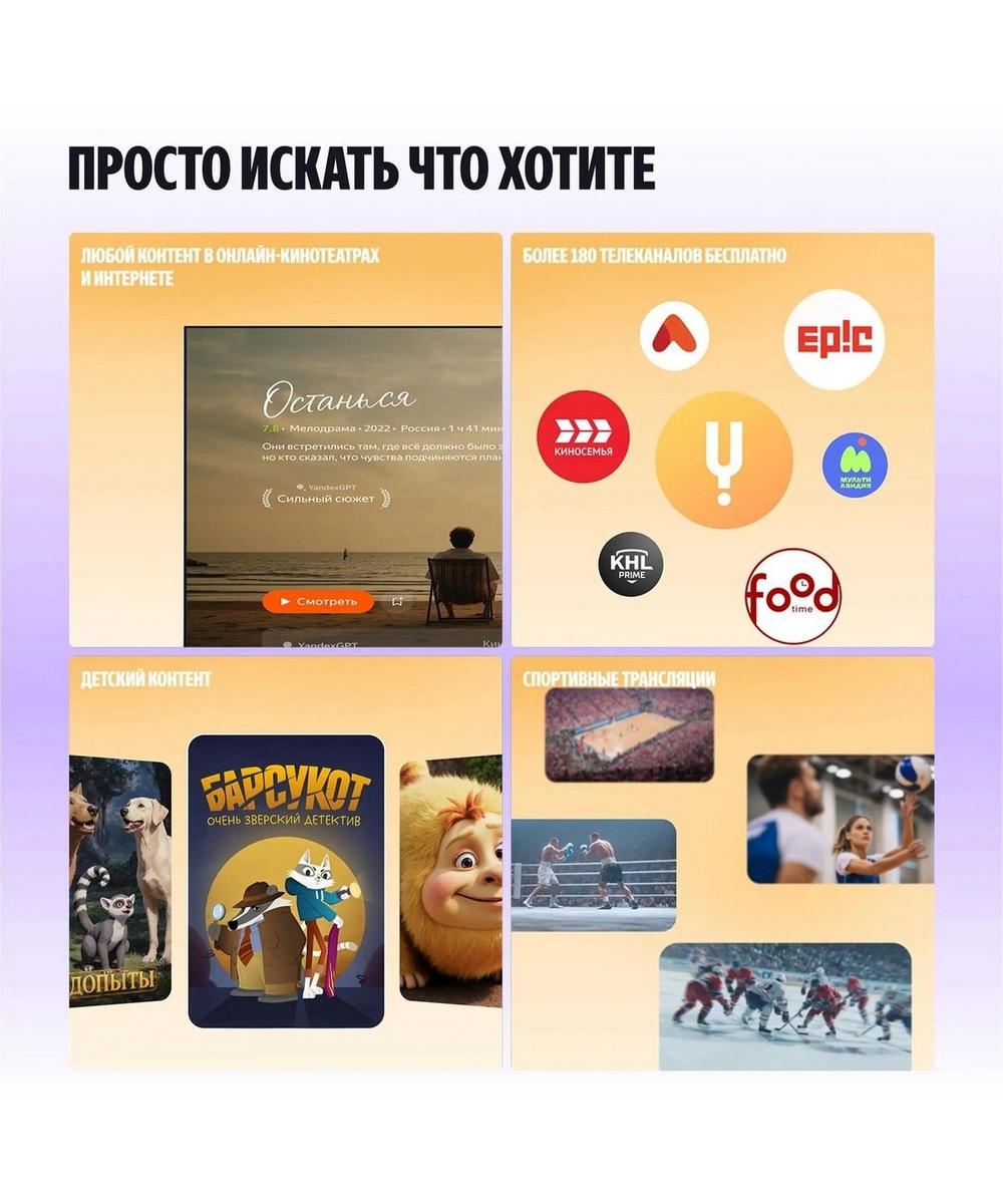 Вы быстро и просто найдёте нужный контент: сериал, фильм, видео, мультфильм, подкаст, спортивную трансляцию, телеканал или песню — достаточно попросить об этом Алису.