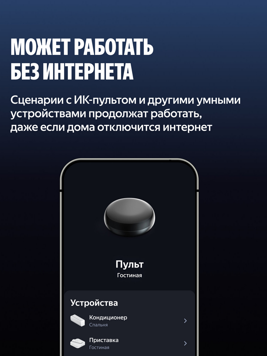 Для подключения умного ИК-пульта вам нужны только Wi-Fi и приложение Дом с Алисой. А если связать пульт с Яндекс Станцией, то сценарии с ним продолжат выполняться, даже если дома отключится интернет².
