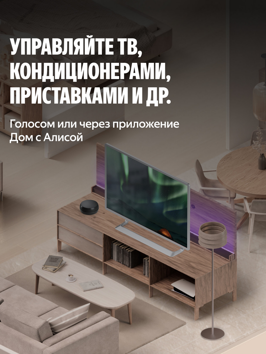 Умный ИК-пульт Яндекса позволяет управлять даже обычной домашней техникой¹ с ИК-портом множеством удобных способов — голосом, удалённо, через сценарии и расписания.