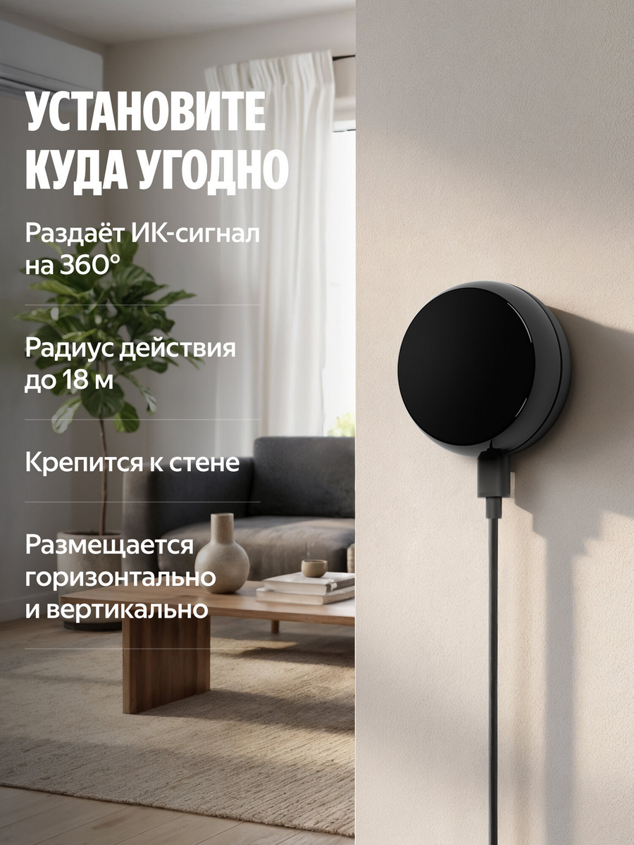 ИК-пульт занимает совсем мало места и излучает сигнал на 360º с радиусом действия до 18 м. Расположите его где удобно — на горизонтальных и вертикальных поверхностях.