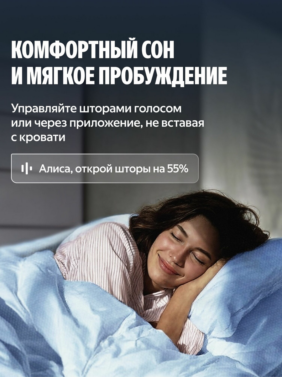 Управлять карнизом легко и удобно разными способами. Если у вас есть Яндекс Станция, вы можете отдавать голосовые команды Алисе, например, попросить открыть шторы на определённый процент. Также управление доступно через приложение Дом с Алисой, где можно настраивать сценарии вместе с другими умными устройствами. Например, шторы могут автоматически закрываться вечером, когда вы включаете свет. В приложении можно выбрать одну из трёх скоростей движения штор.